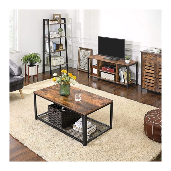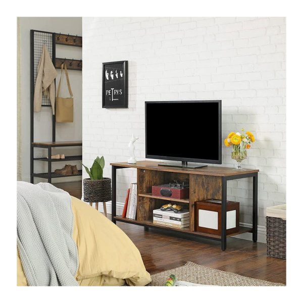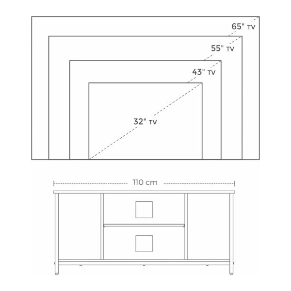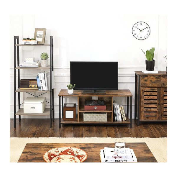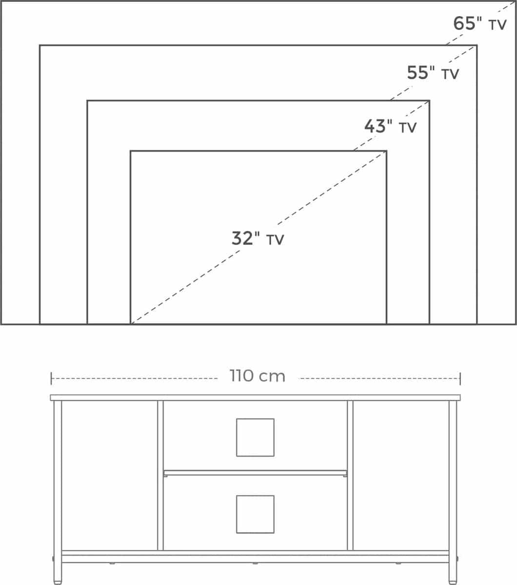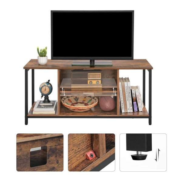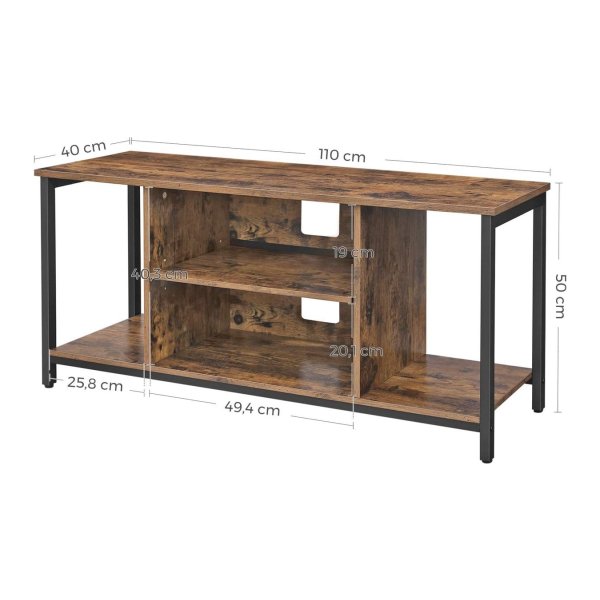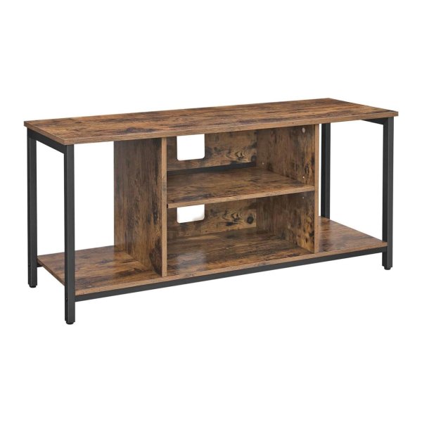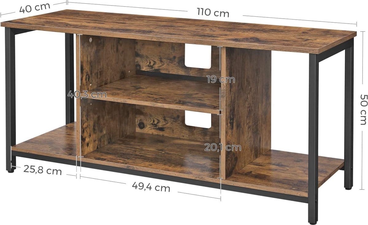 Dit tv-meubel biedt voldoende opslagruimte met 2 open vakken in het midden en aan de zijkanten, samen met een ruim blad om al je spullen netjes op te bergen.