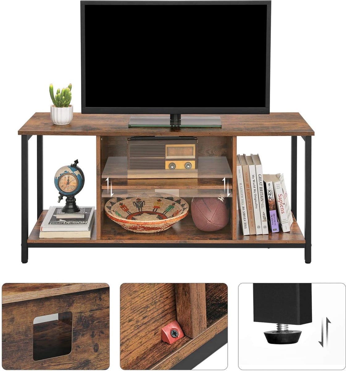 Om ervoor te zorgen dat je elektronica veilig staat, zijn er verstelbare voetjes onder elke metalen poot geplaatst. Zo blijft alles stevig op zijn plek, zelfs op een ongelijke vloer.