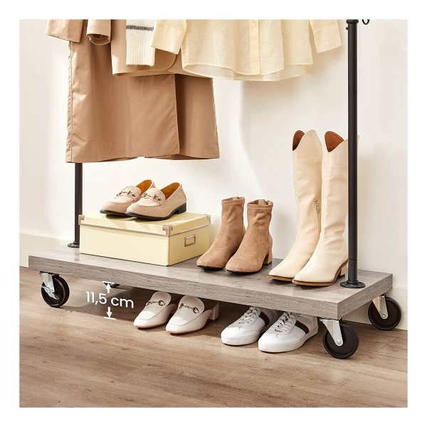 Kapstok en plank in één: Deze kapstok combineert een kledingstang en een schoenenrek in één. Zo kunnen zowel uw kleding als uw schoenen samen op één plaats worden opgeborgen, zodat u er gemakkelijk bij kunt wanneer u een outfit kiest. Hang uw jassen of shirts kreukvrij aan deze kledingroede, zodat u ze niet meer hoeft te vouwen en te strijken. Op de plank onderin passen een paar dozen, waarin u sjaals, sokken of vele andere accessoires kunt opbergen.