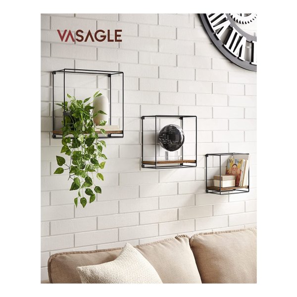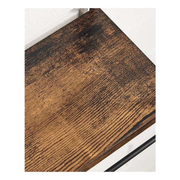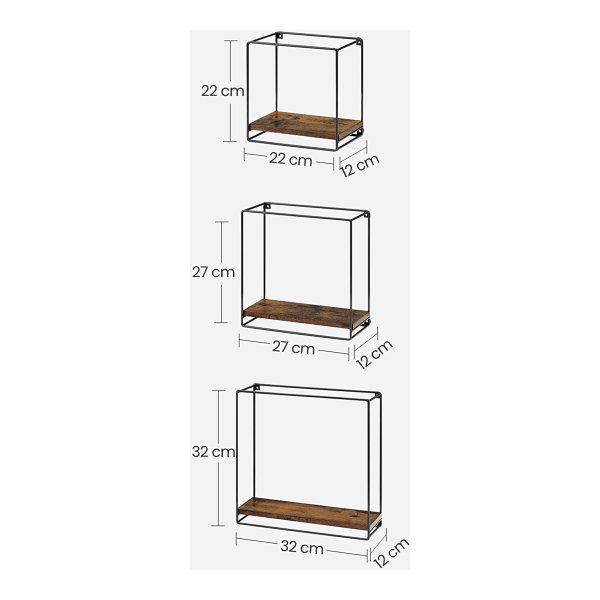 Kleur: vintage bruin-zwart. Materiaal: Houten spaanplaat, staal. Afmetingen van het rek: 32 x 32 x 12 cm (groot) 27 x 27 x 12 cm (midden) 22 x 22 x 12 cm (klein) Afmetingen van de plank: 32 x 10,9 x 0,9 cm (groot) 27 x 10,9 x 0,9 cm (midden). 22 x 10,9 x 0,9 cm (klein). Gewicht: 2,5 kg. Max. Statisch draagvermogen van het grote rek: 10 kg. Max. Statisch draagvermogen van het middelste rek: 6,8 kg. Max. Statische belastbaarheid van het kleine rek: 5kg