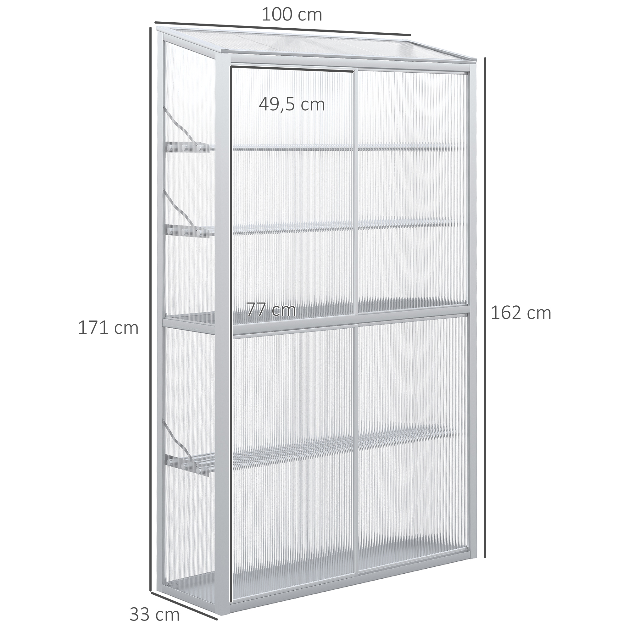 | Bullet Point 5 | Bescherm uw planten tegen ongedierte als u het huis verlaat, of laat ze open staan āāvoor vrije ventilatie. Gebouwd voor gebruik buitenshuis: De dubbelwandige polycarbonaat panelen hebben een lichttransmissie van 90%, waardoor het kweekbed veel warmte kan opnemen en vasthouden. voor een lange tijd kan. Het roestvrije frame van aluminiumlegering is bestand tegen vrijwel alle weersomstandigheden. Door het schuine dak kan regenwater ongehinderd weglopen. Gemakkelijk schoon te maken: De panelen en platen van de behuizing kunnen eenvoudig worden gereinigd met een vochtige doek. Productdetails: Totale afmetingen: 100L x 33B x 162/171H cm, draagvermogen: 25 kg (per plank). Montage vereist. |