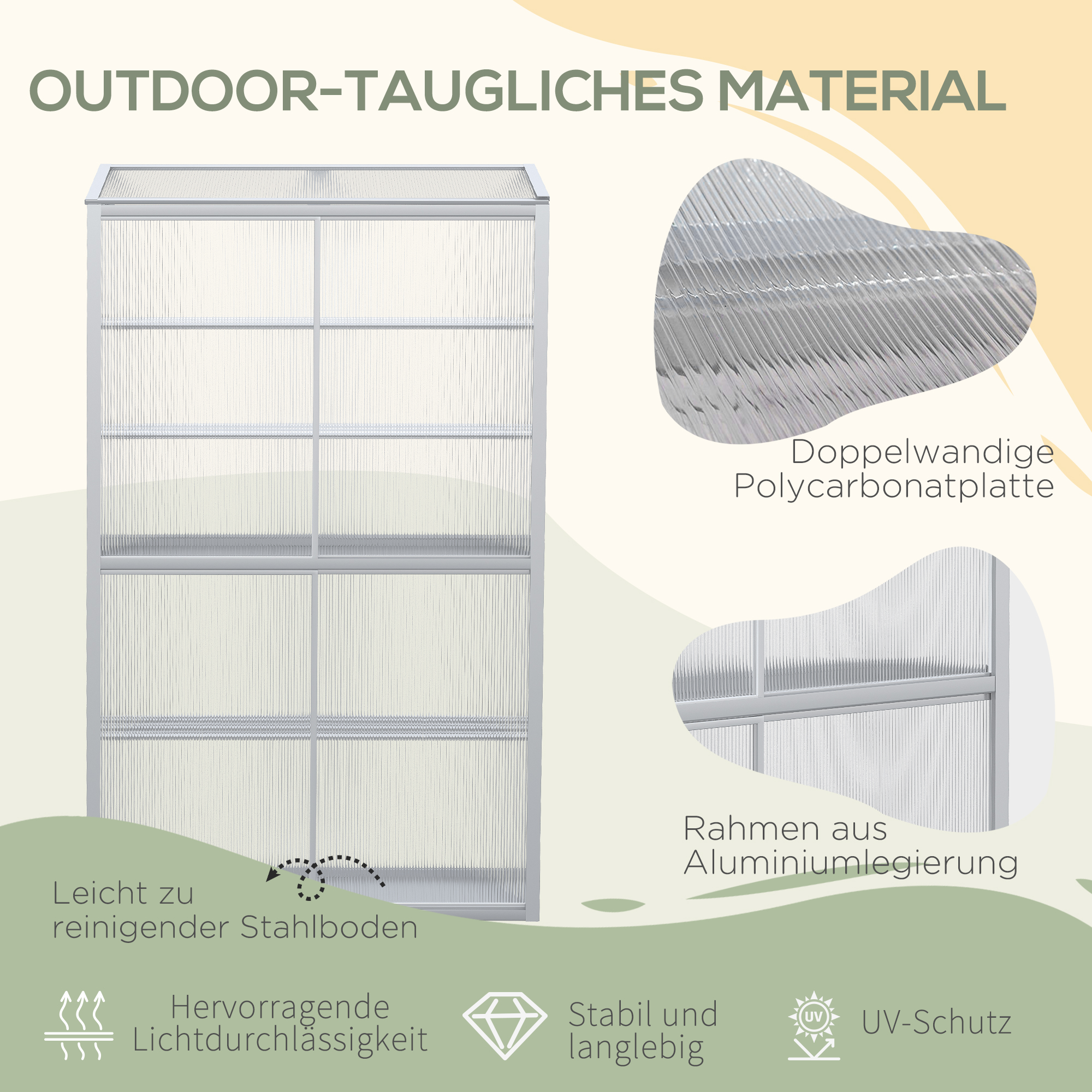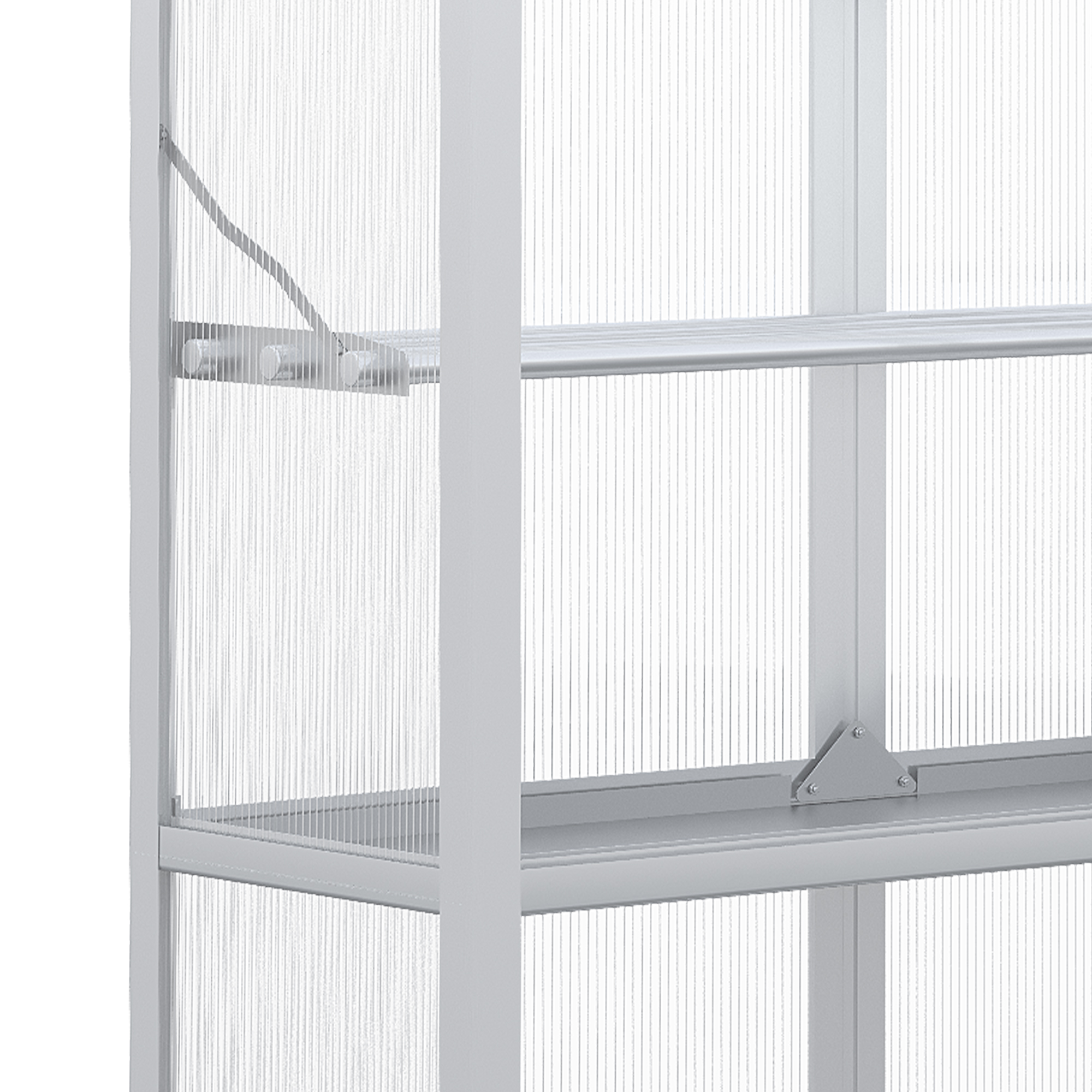 Het dubbelwandige polycarbonaat paneel heeft een lichttransmissie van 90%, waardoor er voldoende warmte en licht naar binnen komt om uw planten te laten gedijen. Het robuuste en weerbestendige aluminium frame is voorzien van een beschermende coating om de tuinkas duurzaam en bestand tegen alle weersomstandigheden te maken.