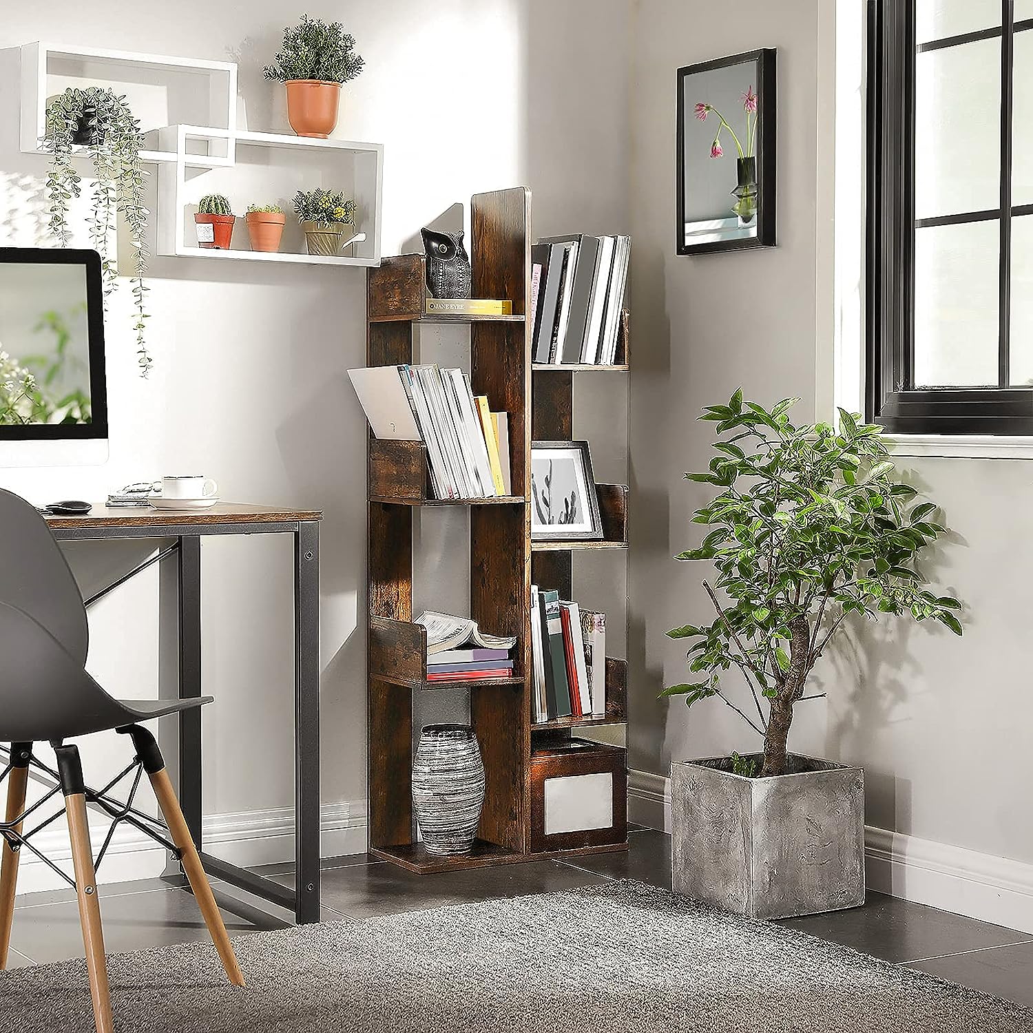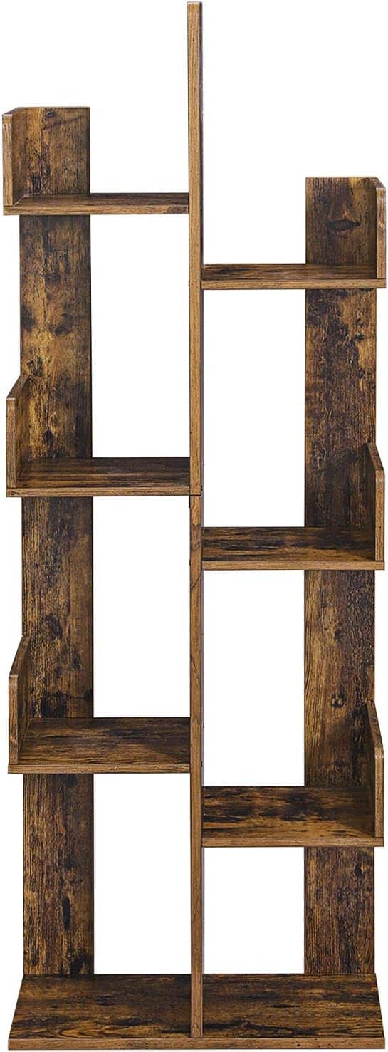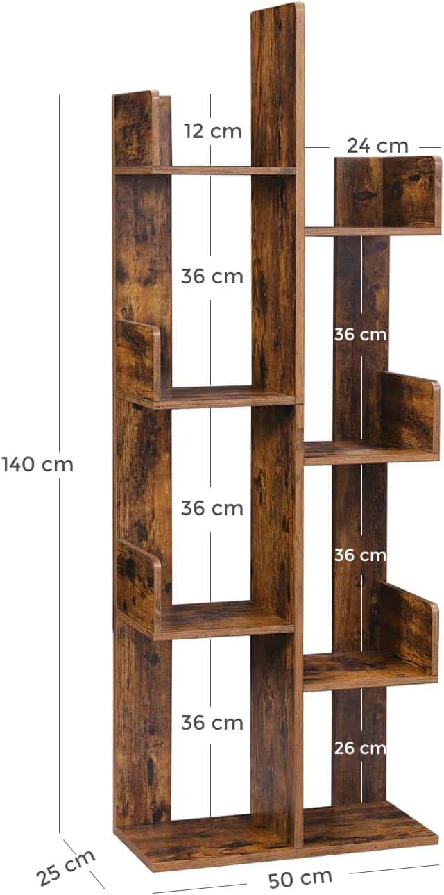 Vormige boomvormige boekenplank, staande plank met 8 vakken, opbergrek, met afgeronde hoeken, vintage bruin