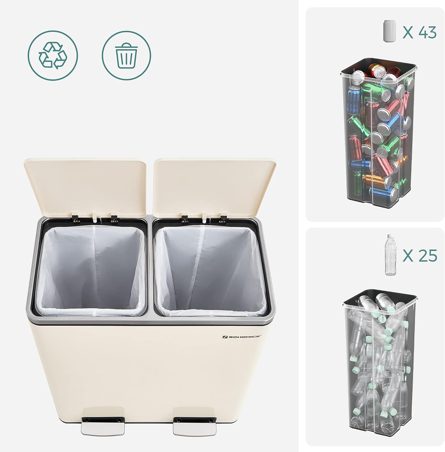 Tags: 2 compartimenten, 2 x 30 L, creme wit, LTB060A01, met 15 vuilniszakken, metalen pedaalemmer, Vuilnisbak