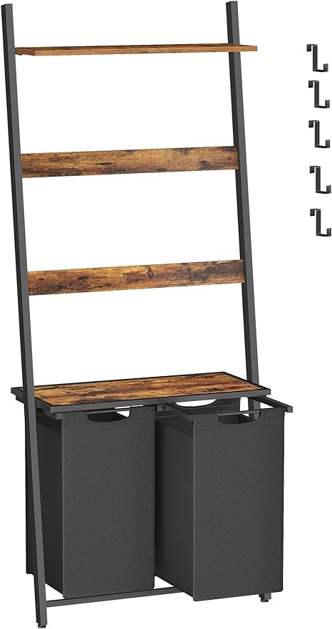 Wasmand 2 vakken met handdoekrek Vintage Bruin Zwart – Wasmand uitneembaar – 73 x 33 x 177 cm