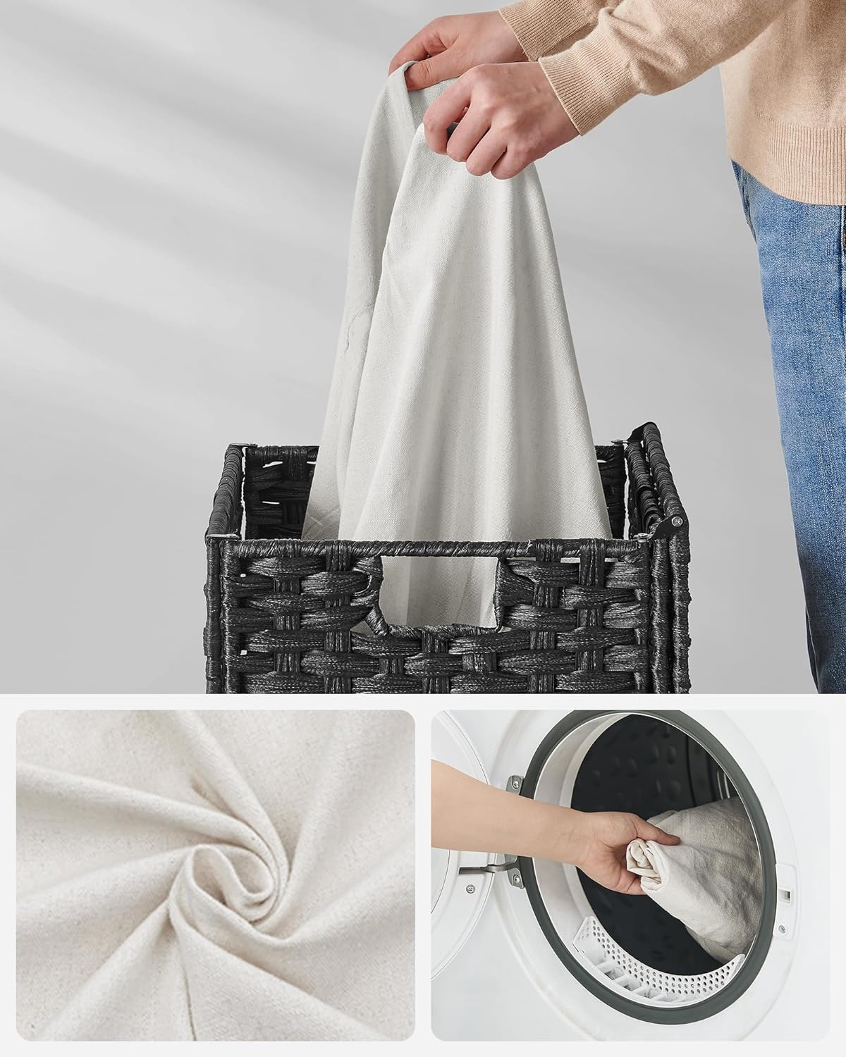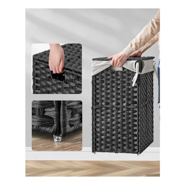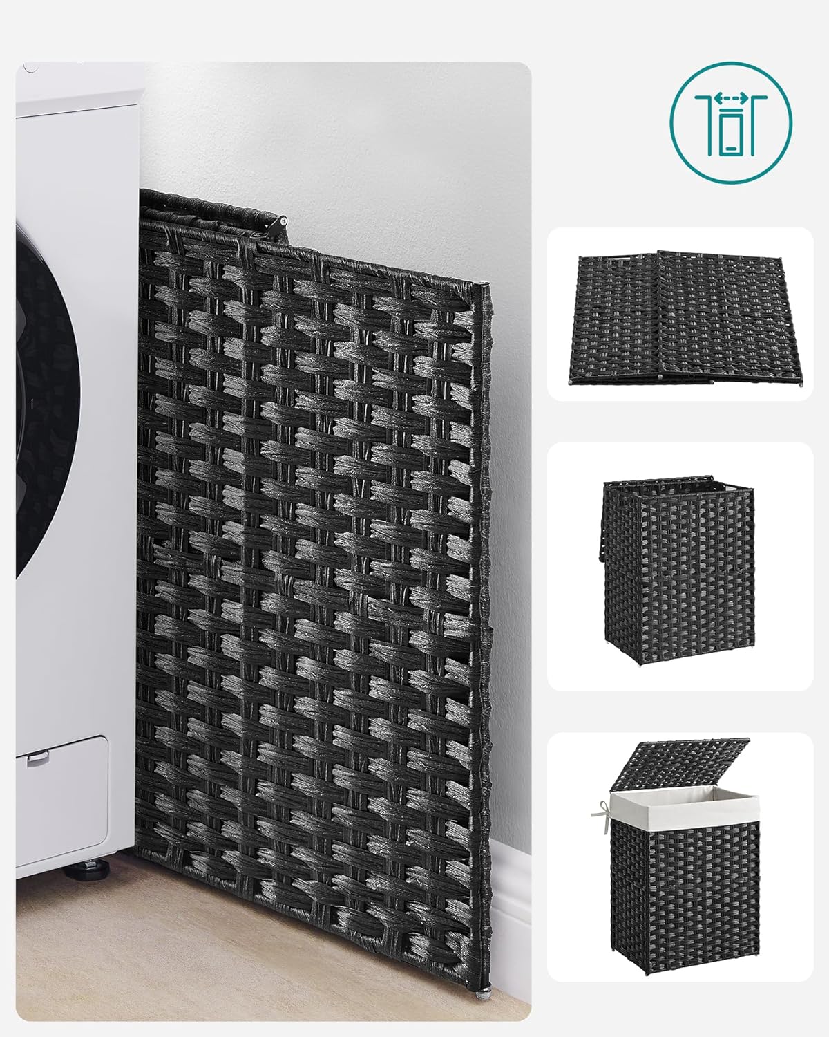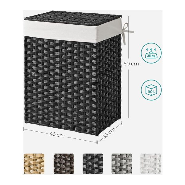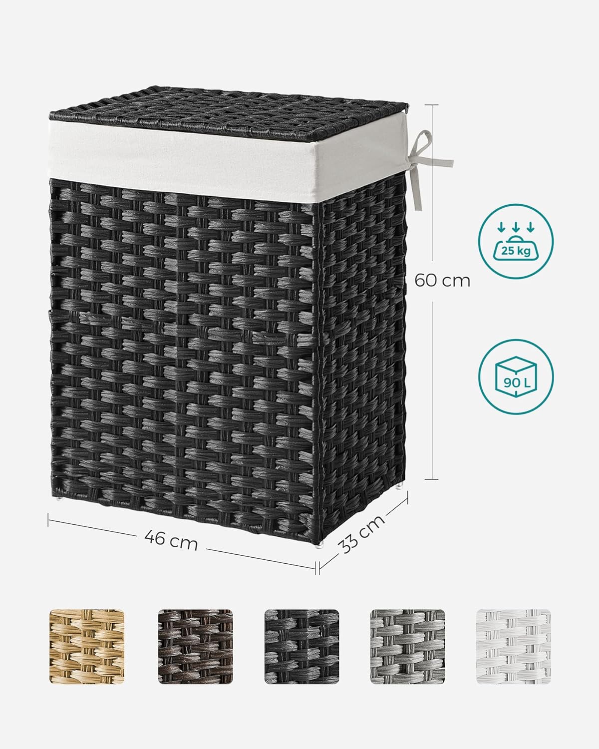 Wasmand handgeweven, synthetische rotan wasmand, met deksel en handvatten, opvouwbare, afneembare waszak, 90 L, zwart