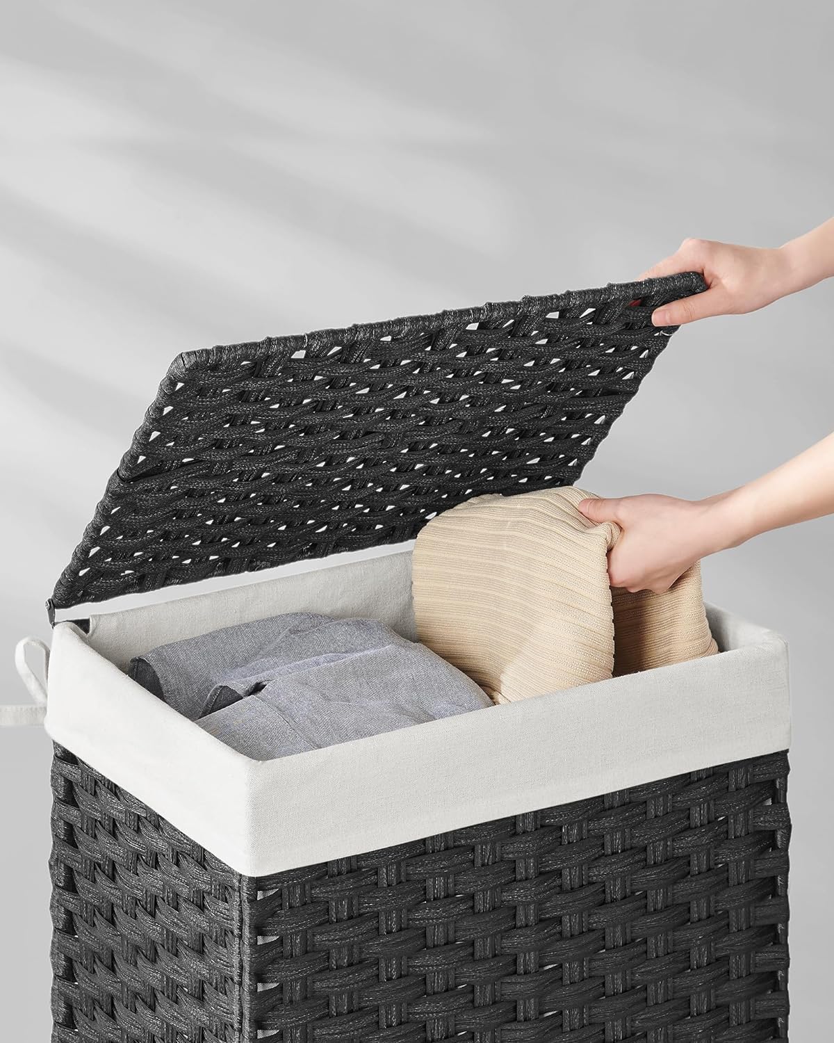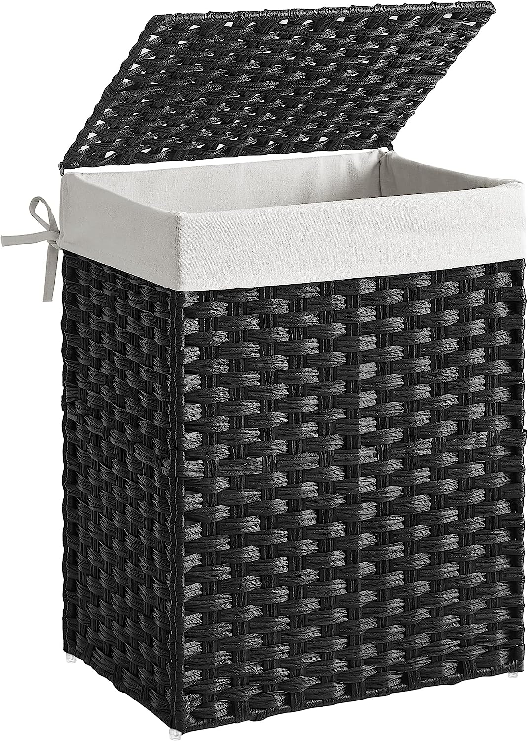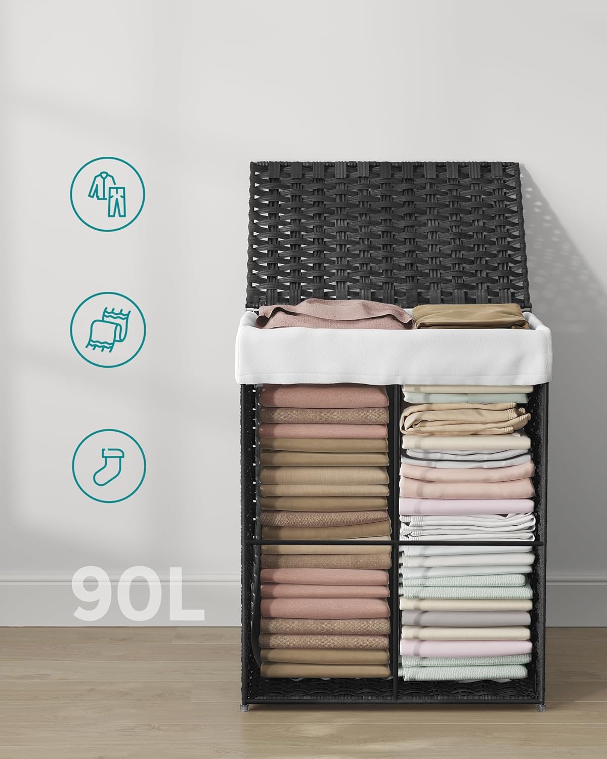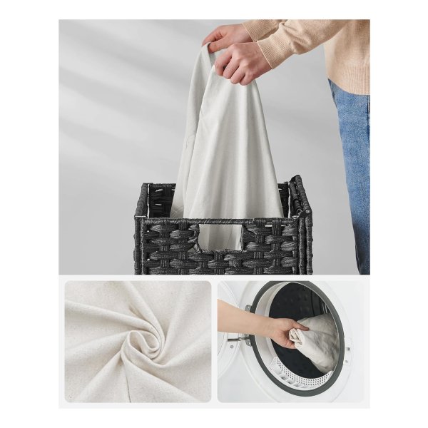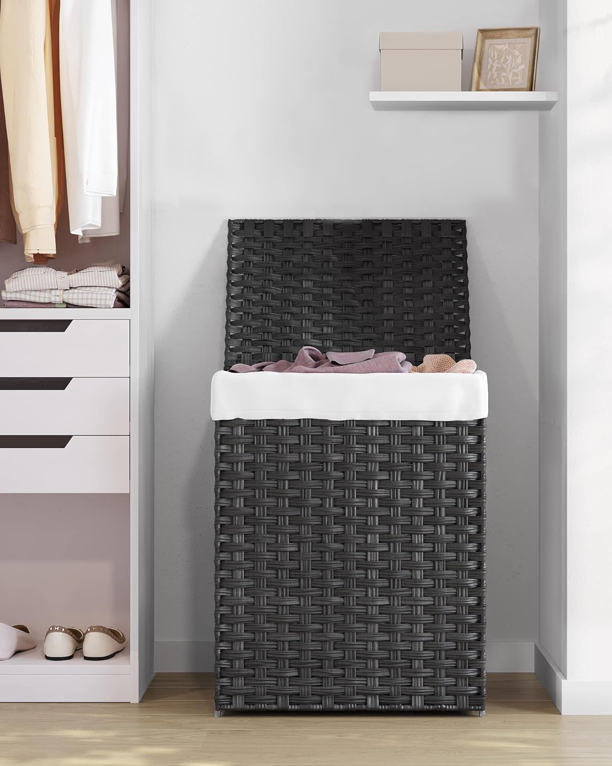 Wasmand handgeweven, synthetische rotan wasmand, met deksel en handvatten, opvouwbare, afneembare waszak, 90 L, zwart