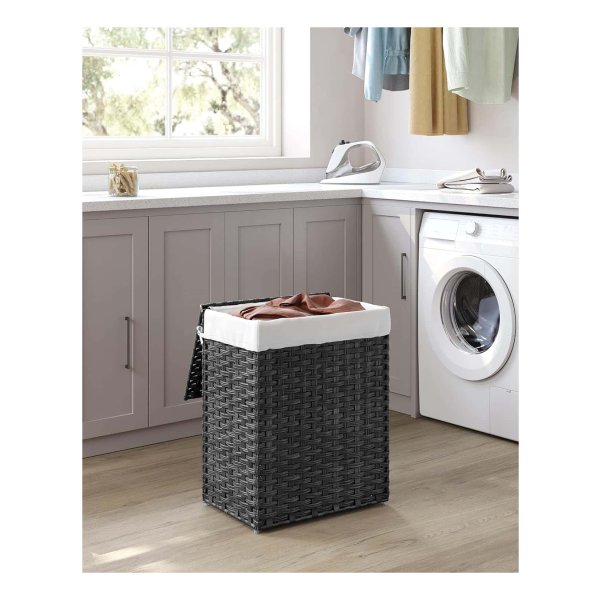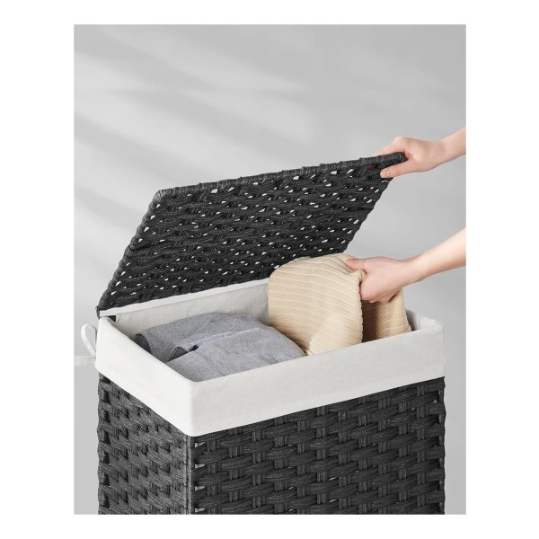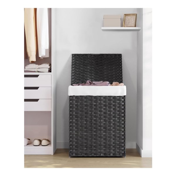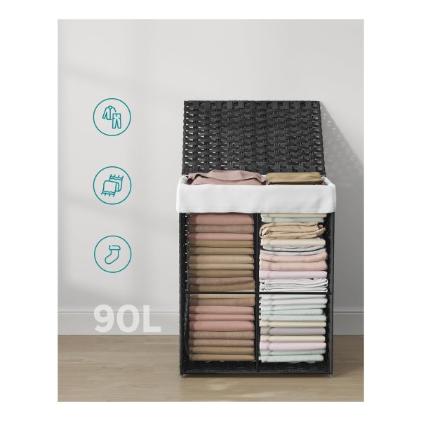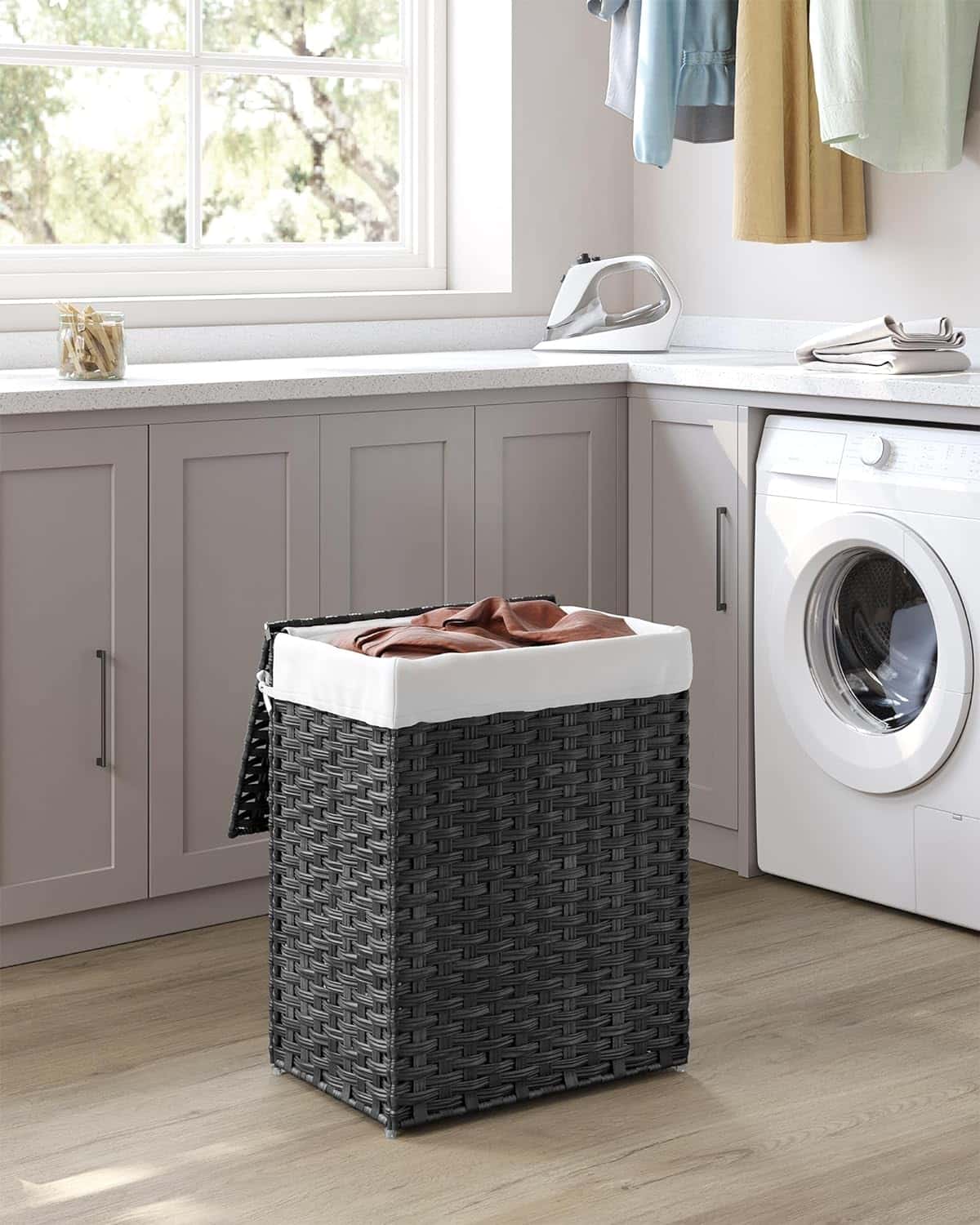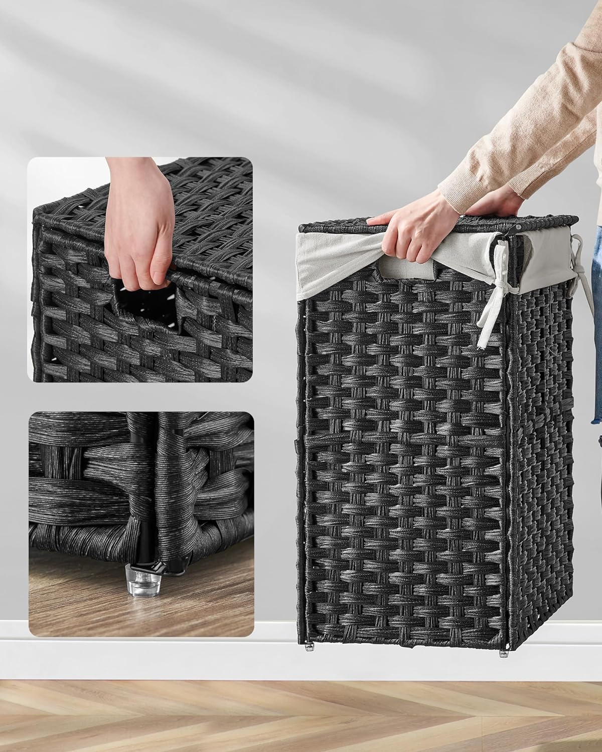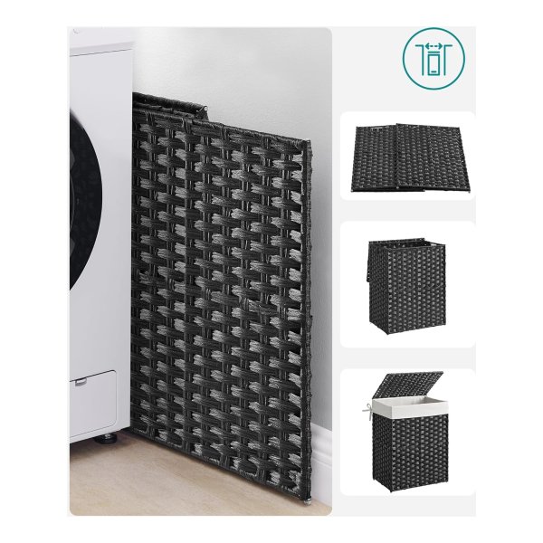 Wasmand handgeweven, synthetische rotan wasmand, met deksel en handvatten, opvouwbare, afneembare waszak, 90 L, zwart