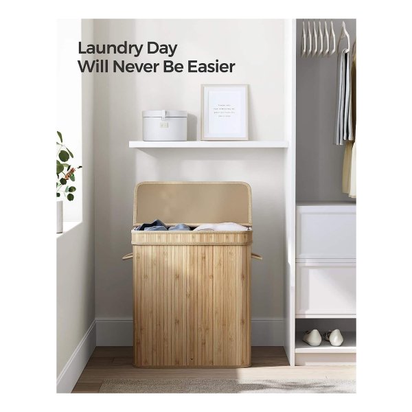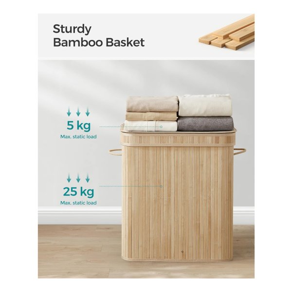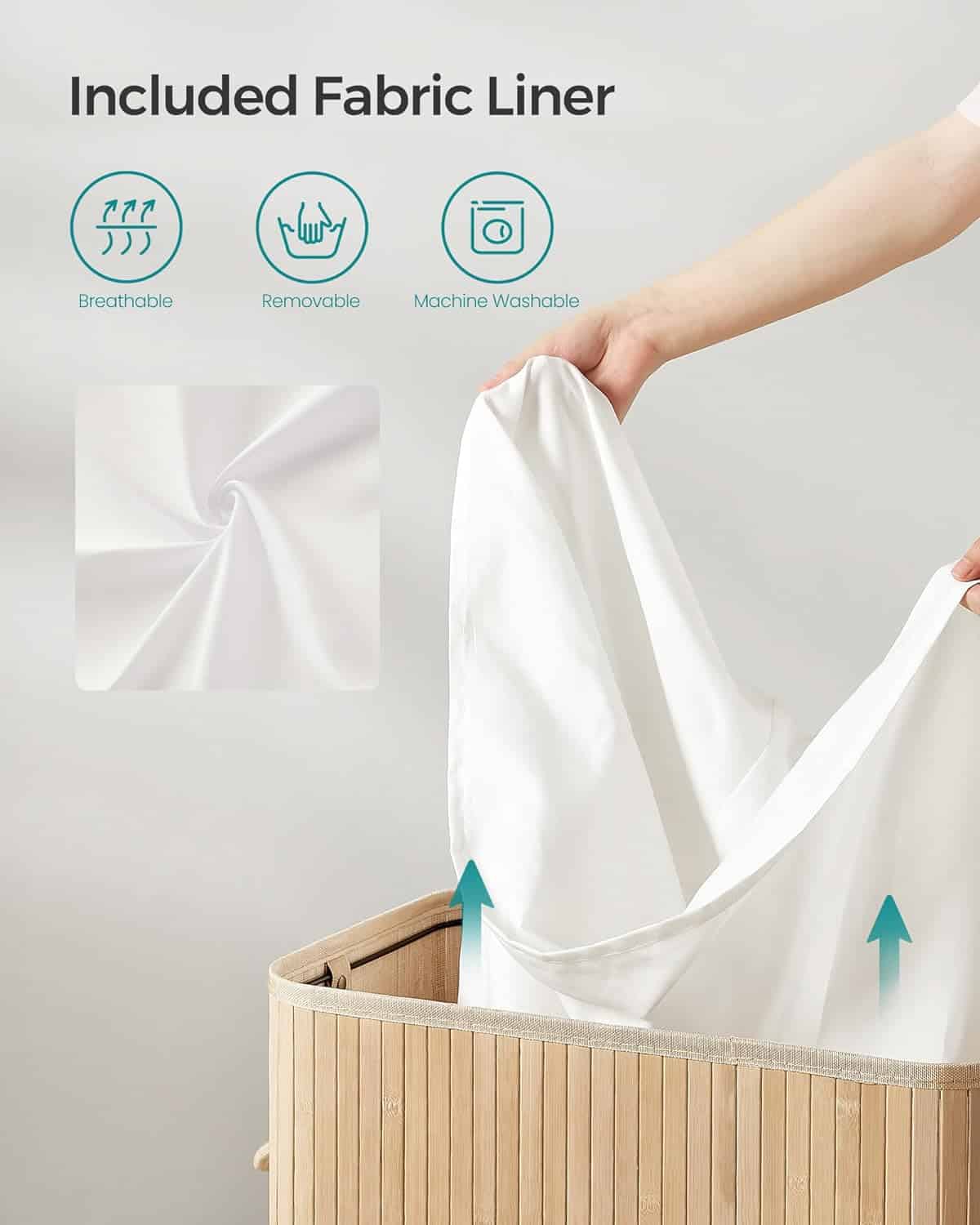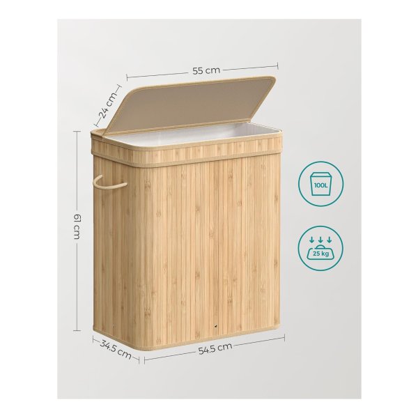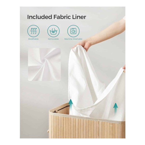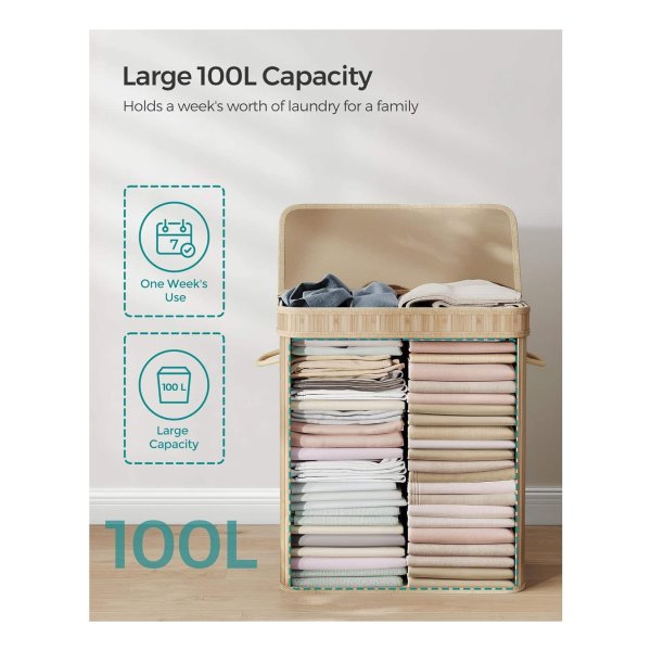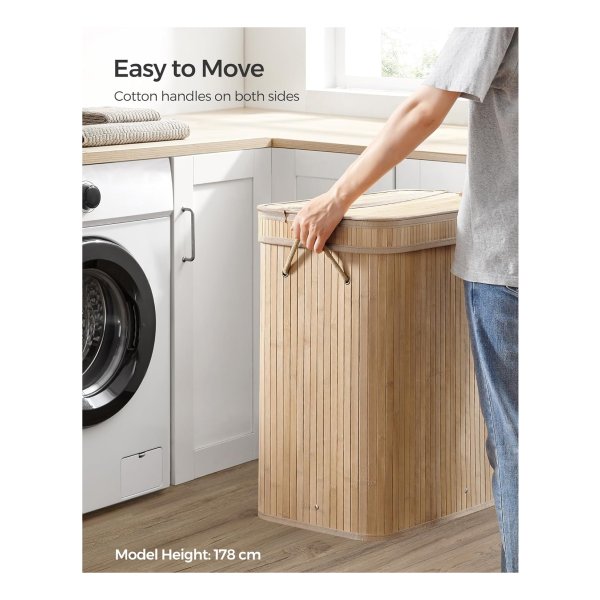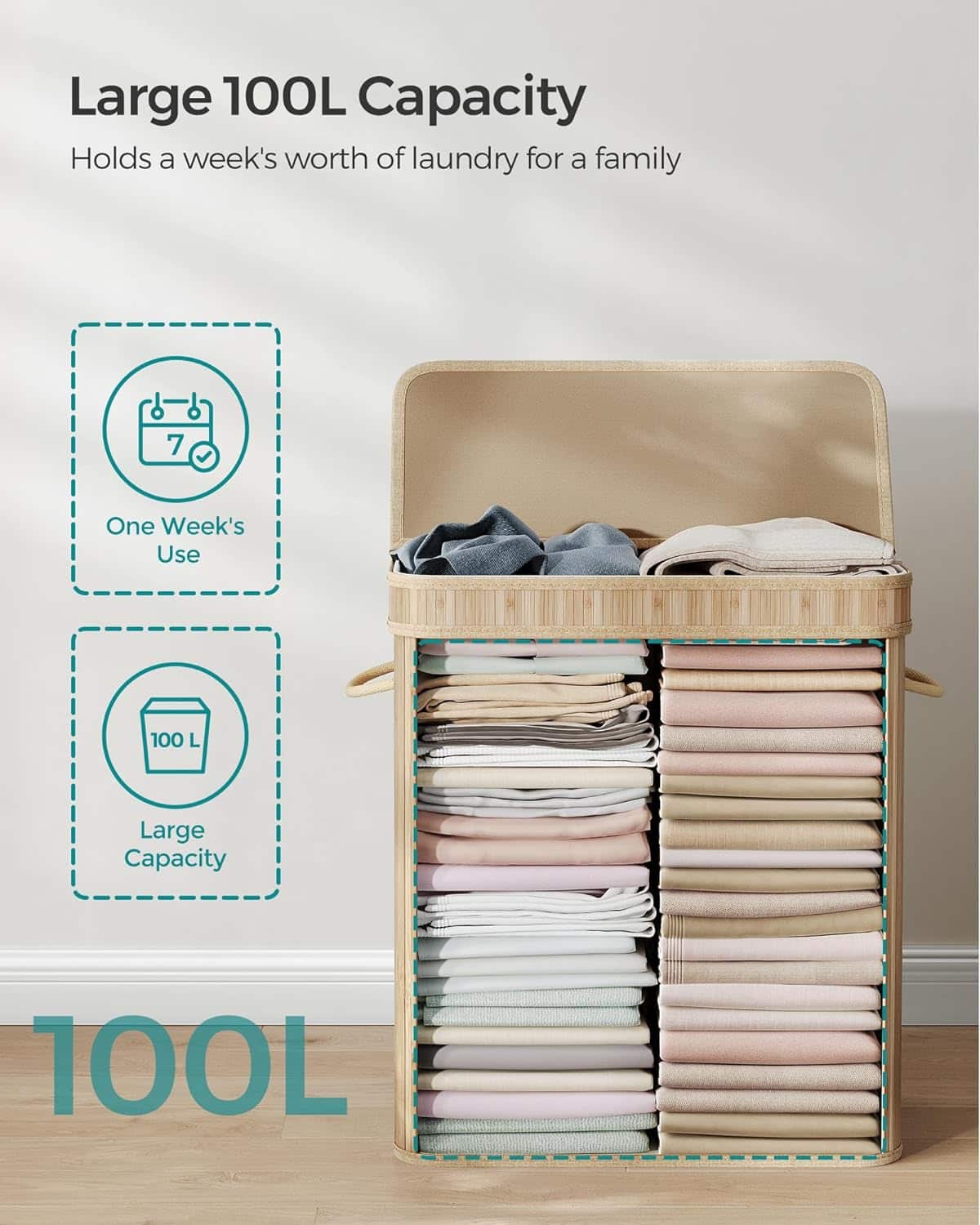 Wasmand met deksel, 100 L, wasverzamelaar bamboe, waszak uitneembaar en machinewasbaar, met handgrepen, voor bijkeuken, slaapkamer, woonkamer, natuurlijke kleuren