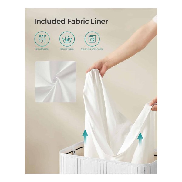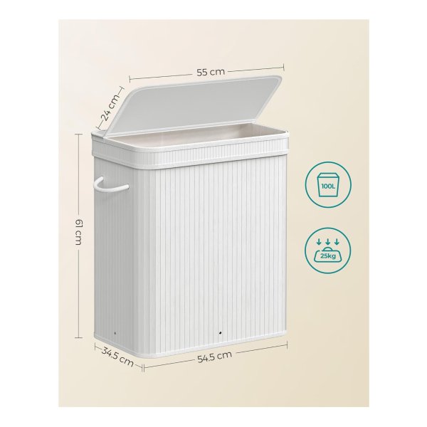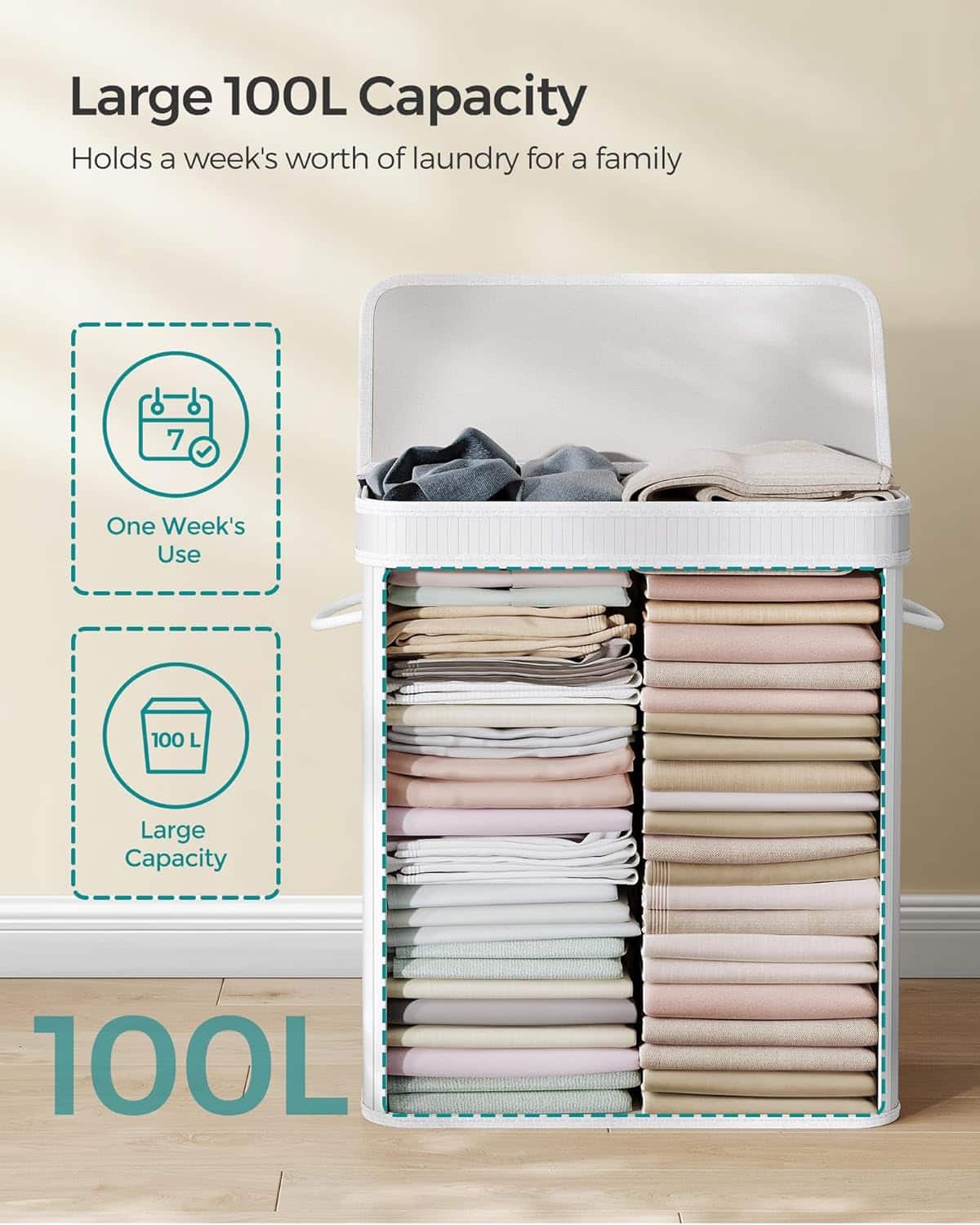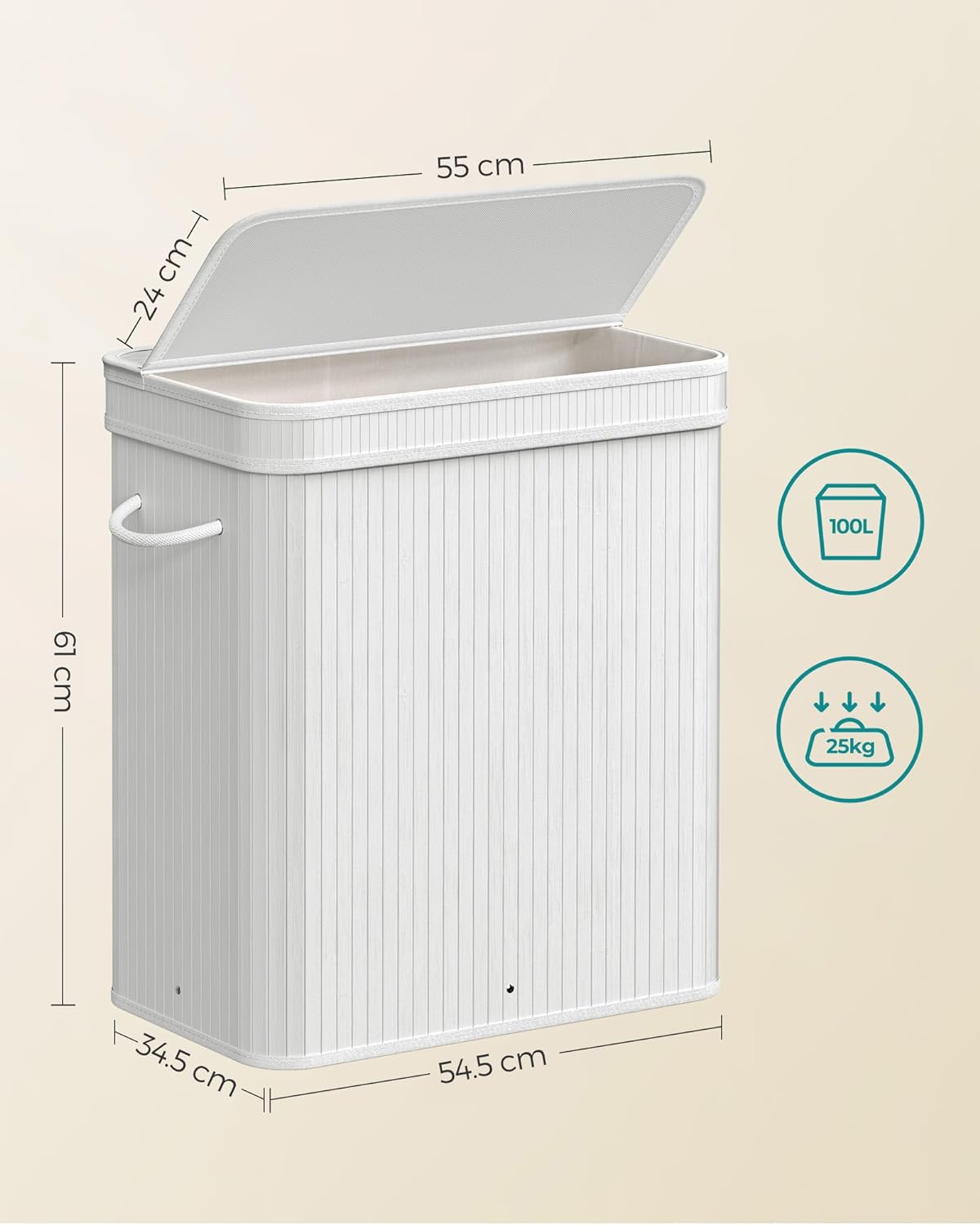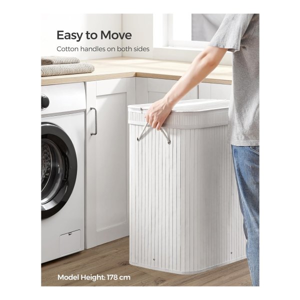 Wasmand met deksel, 100 liter, wasverzamelaar bamboe, waszak uitneembaar en machinewasbaar, met handgrepen, voor bijkeuken, slaapkamer, woonkamer, wit