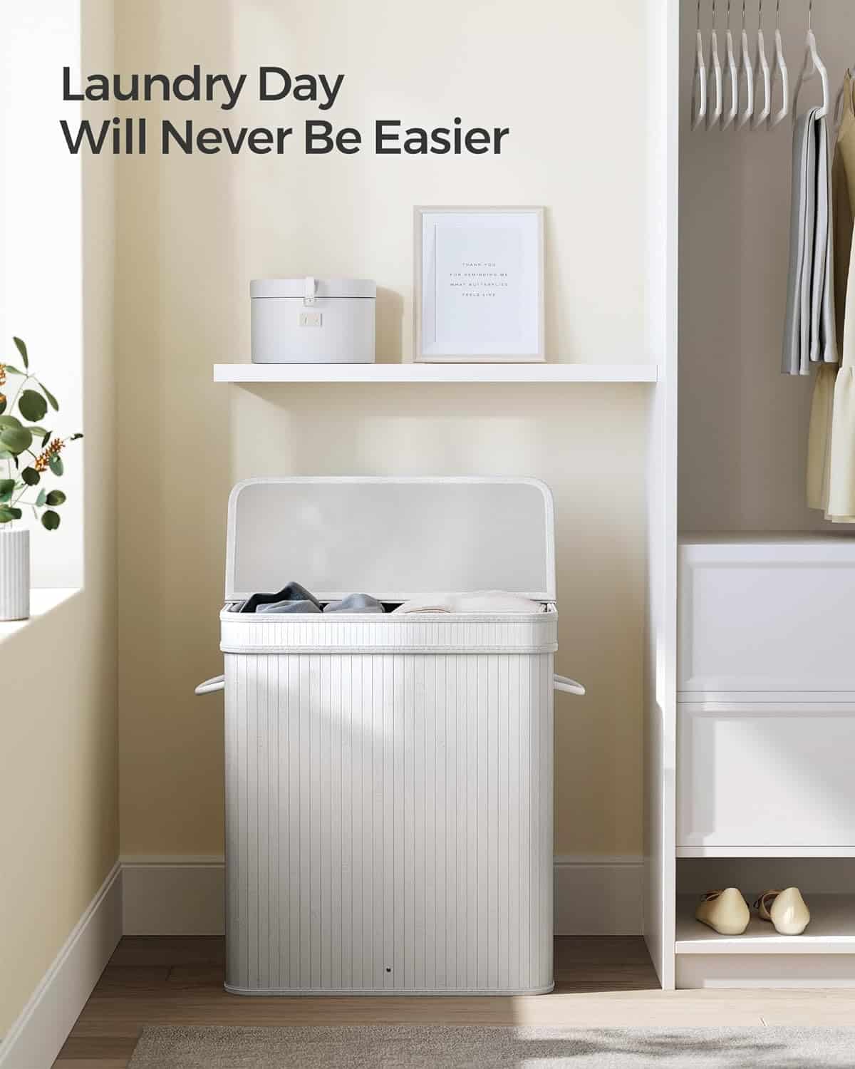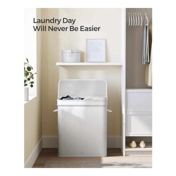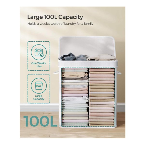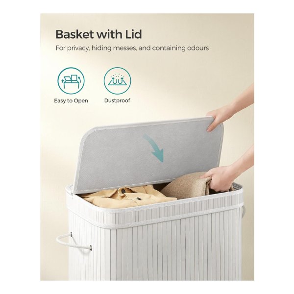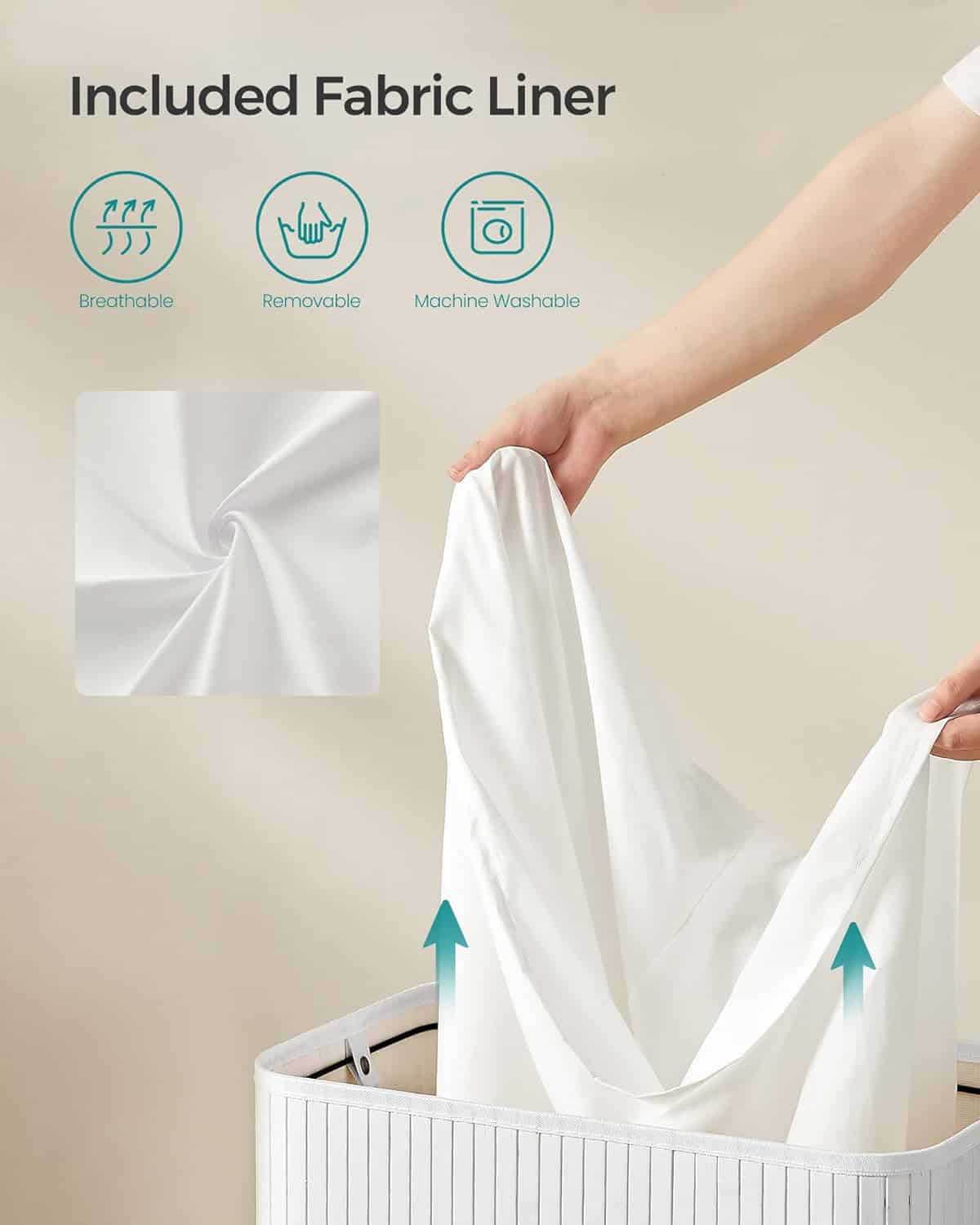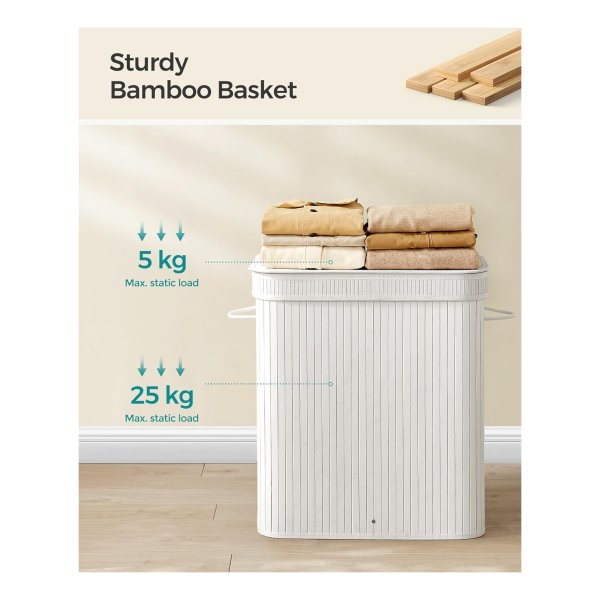 Wasmand met deksel, 100 liter, wasverzamelaar bamboe, waszak uitneembaar en machinewasbaar, met handgrepen, voor bijkeuken, slaapkamer, woonkamer, wit