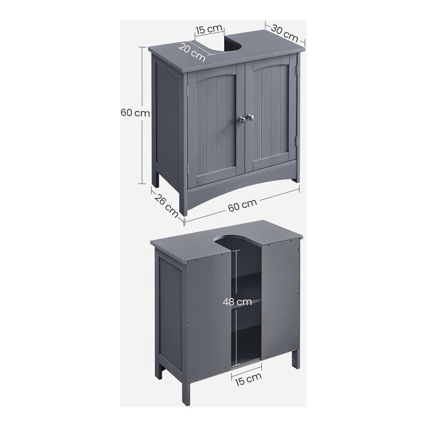 - Deze prachtige wastafelonderkast is een perfecte toevoeging aan uw badkamer. De onderkast heeft een landelijke stijl en is gemaakt van hoogwaardig materiaal. De kast heeft twee deuren en een verstelbare plank, waardoor u veel opbergruimte heeft. De kast is 60 cm breed, 30 cm diep en 60 cm hoog en heeft een mooie grijze kleur.