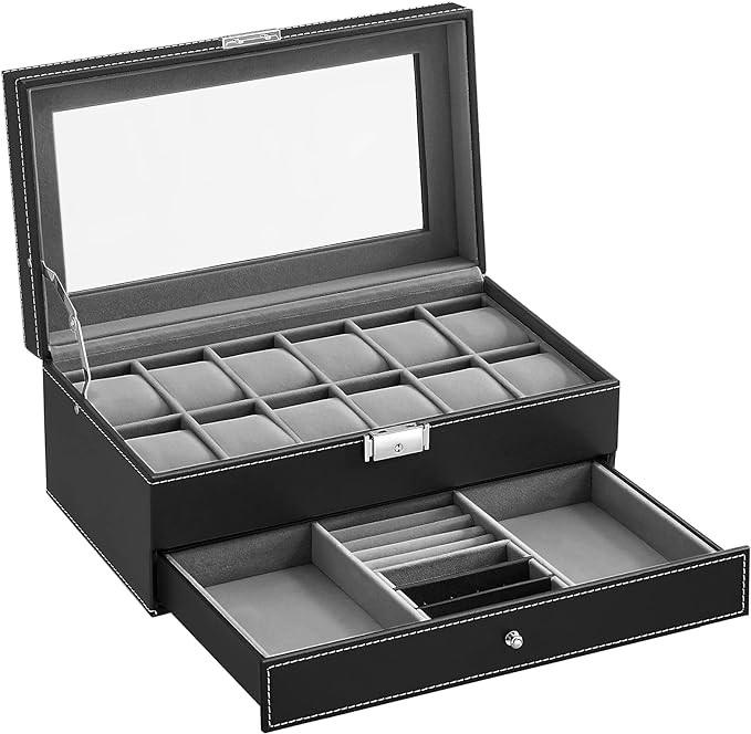 | Bullet Point 1 | [2 lagen voor horloges en meer] Deze horlogebox beschikt over 12 slots bovenaan voor horloges met een weergavegrootte tot 48 mm.Verschillende compartimenten in de onderste lade kunnen uw ringen, armbanden en andere sieraden opslaan |