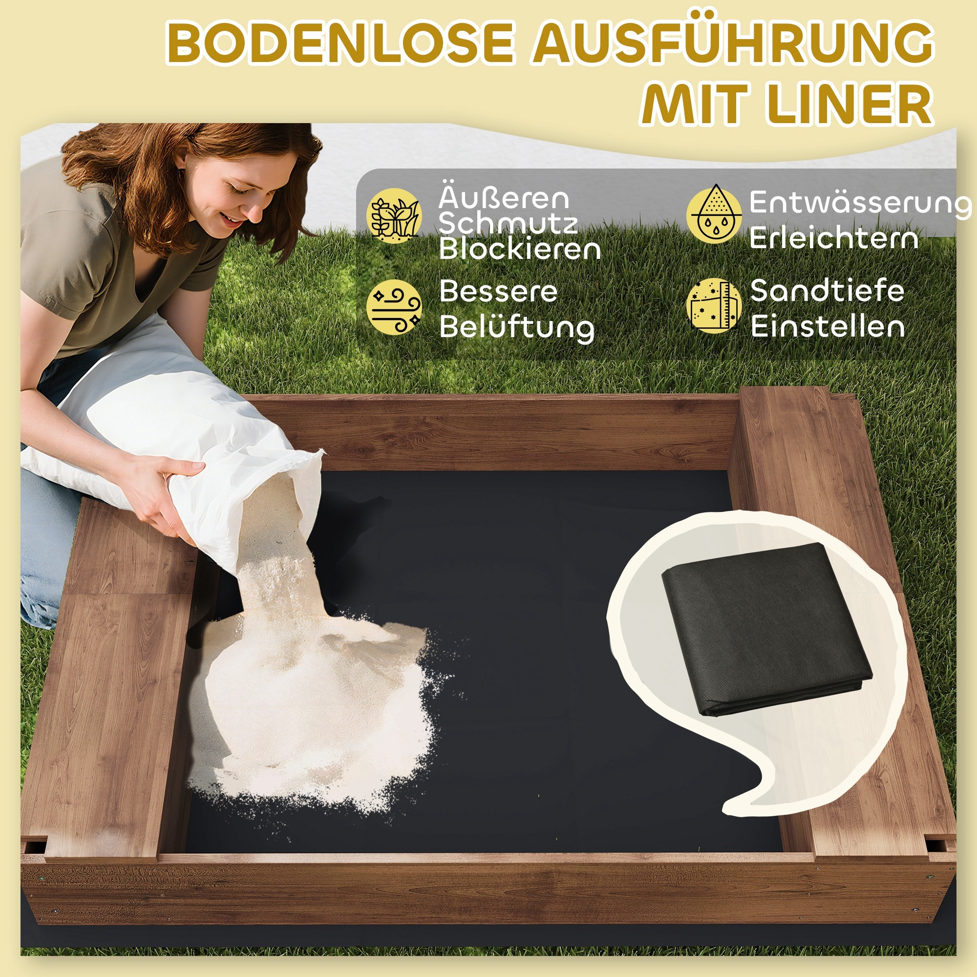 Het onderzeil van de zandbak zorgt ervoor dat het zand op zijn plaats blijft en beschermt tegelijkertijd tegen onkruid, insecten en vocht, waardoor een schone speelomgeving wordt gegarandeerd. De totale afmetingen van de zandbak zijn 142B x 101,5D x 131H cm, met een belastingslimiet van 30 kg per zitplaats en een aanbevolen leeftijd van 3-6 jaar.