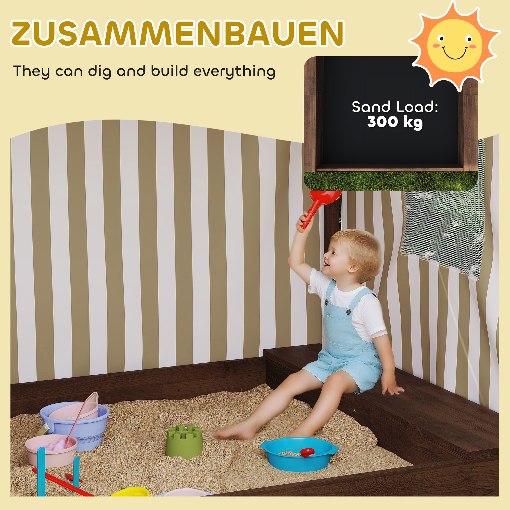 Ultieme speelparadijs voor kinderen met zandbakluifel, banken voor 4 kinderen, opbergruimte en bodembescherming. Beschermt tegen zon, muggen en zorgt voor eindeloos speelplezier met 280 kg zandcapaciteit. Gemaakt van sparrenhout en polyester.