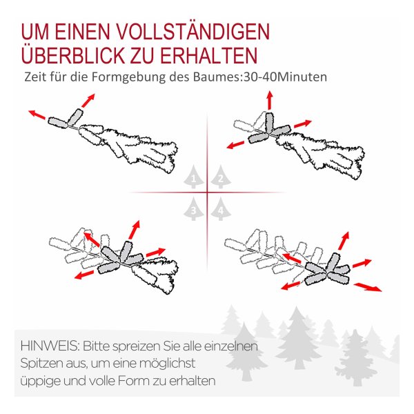 Let op: Deze kunstkerstboom is geschikt voor binnengebruik. Verdeel de takken gelijkmatig voor een weelderige uitstraling. Het vormen van de boom kost ongeveer 30-40 minuten. De levering omvat alleen de boom met standaard, kerstversiering niet inbegrepen.