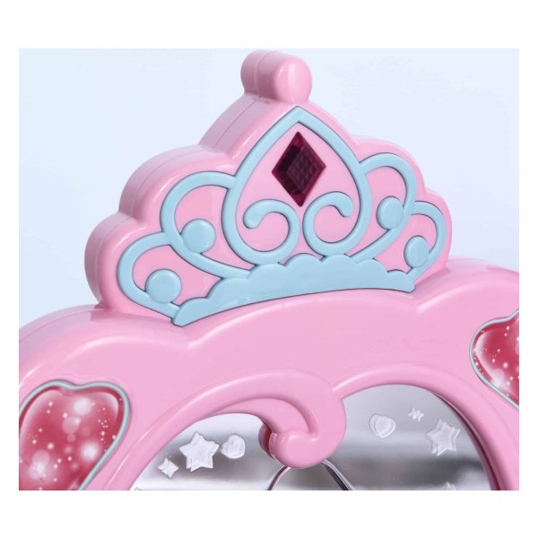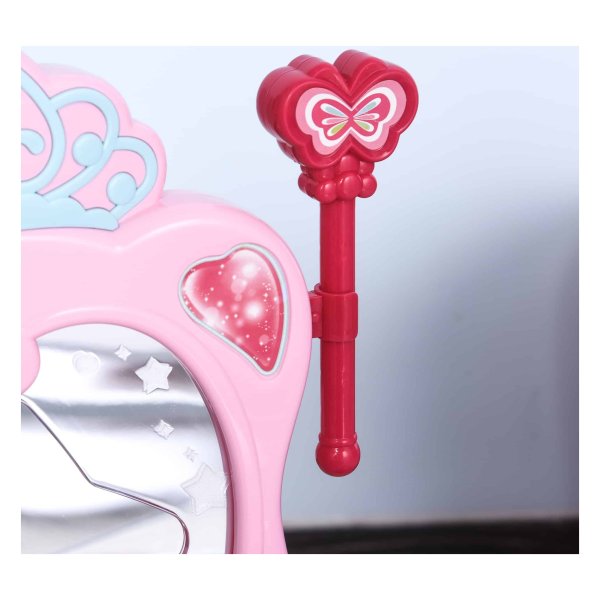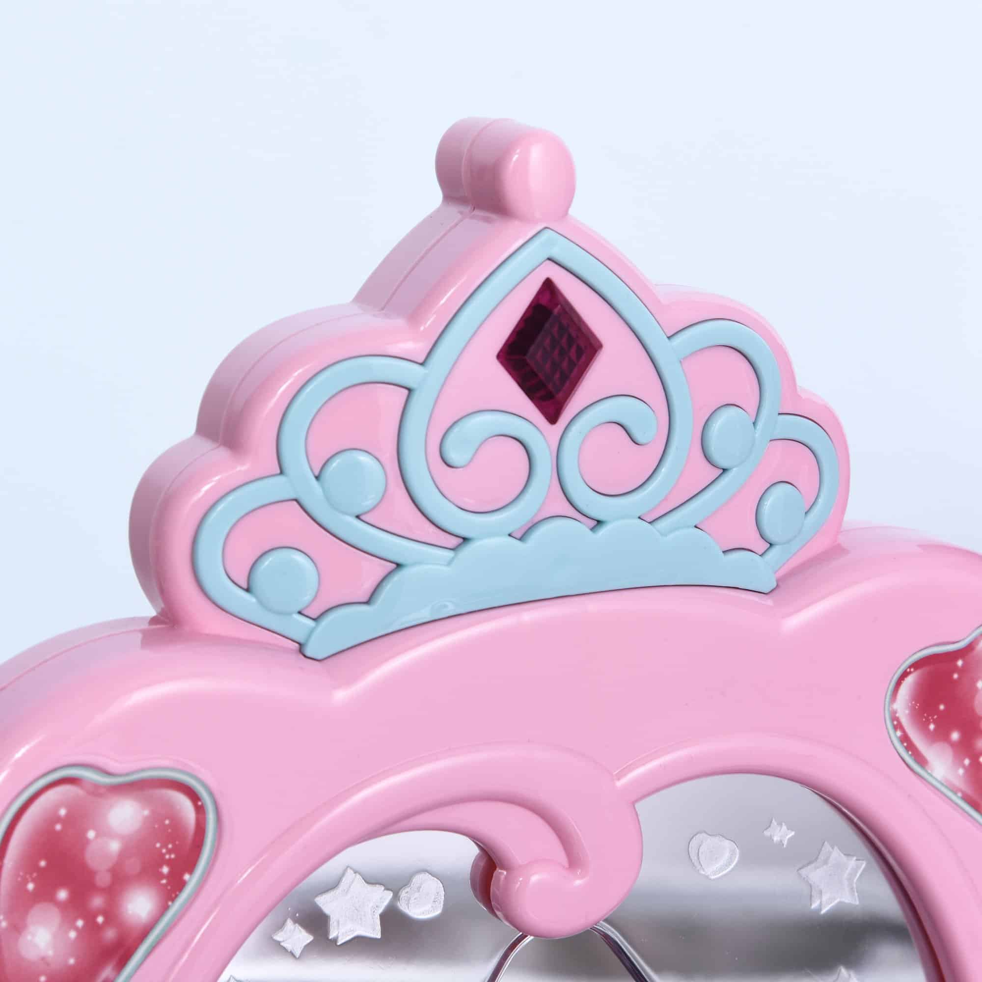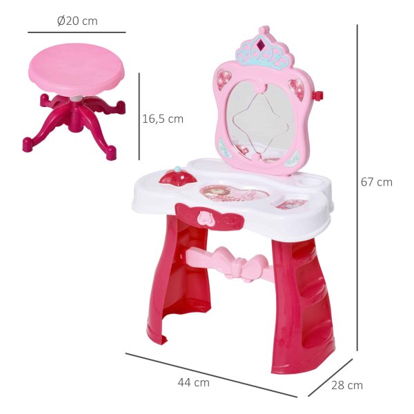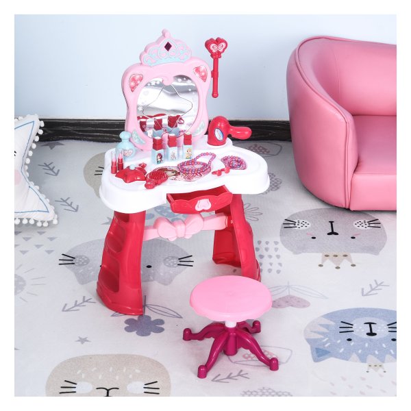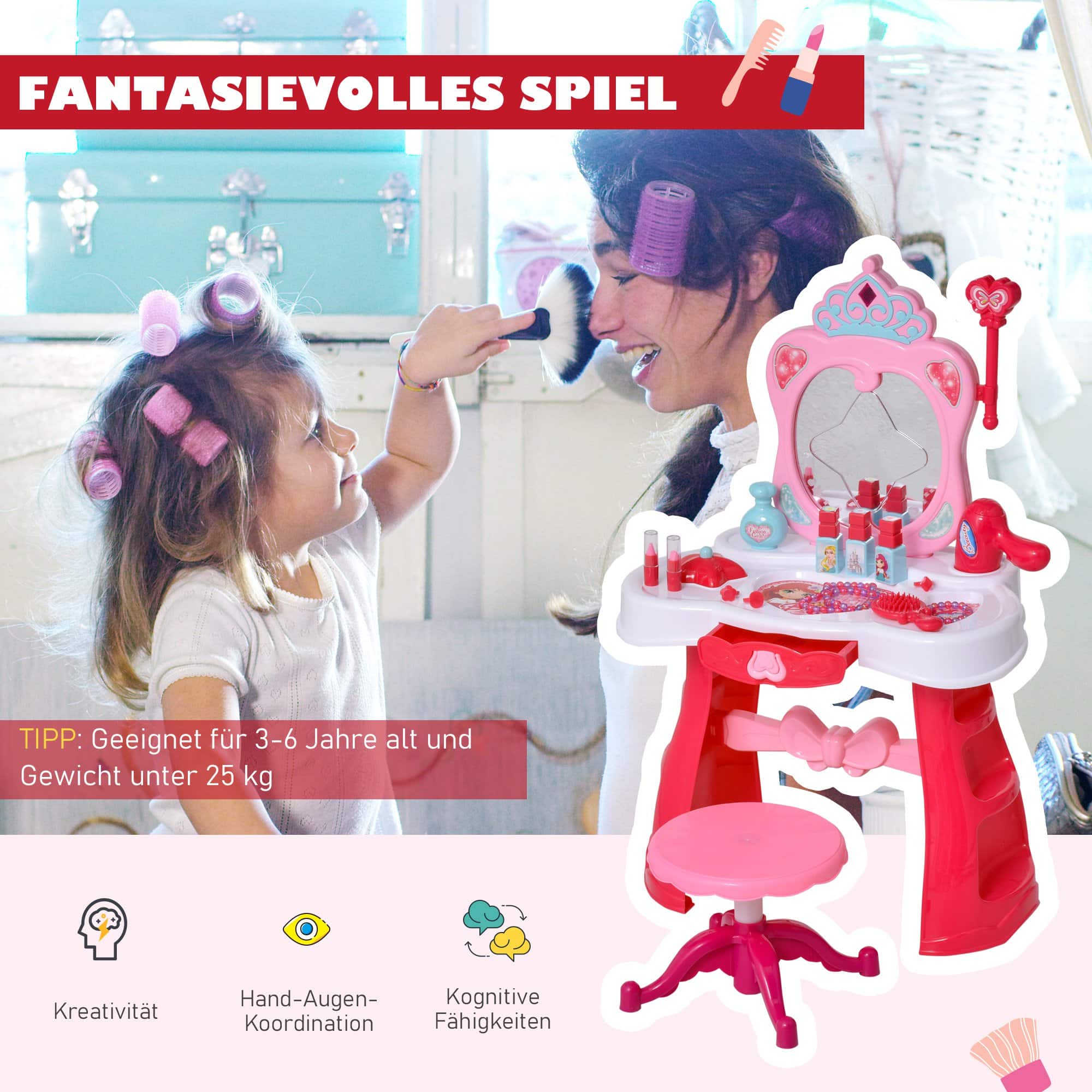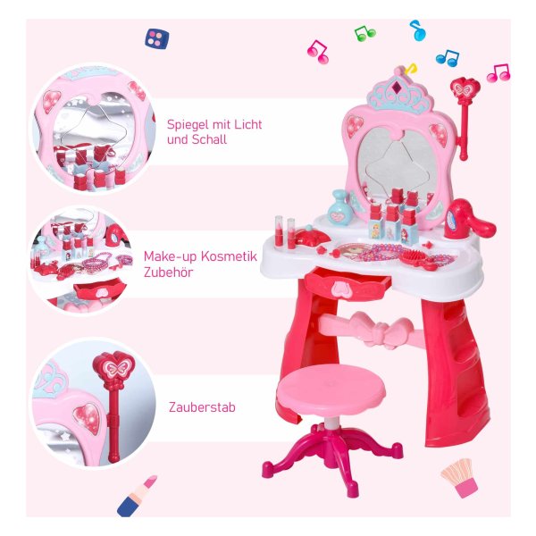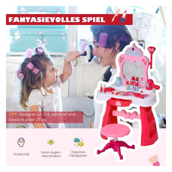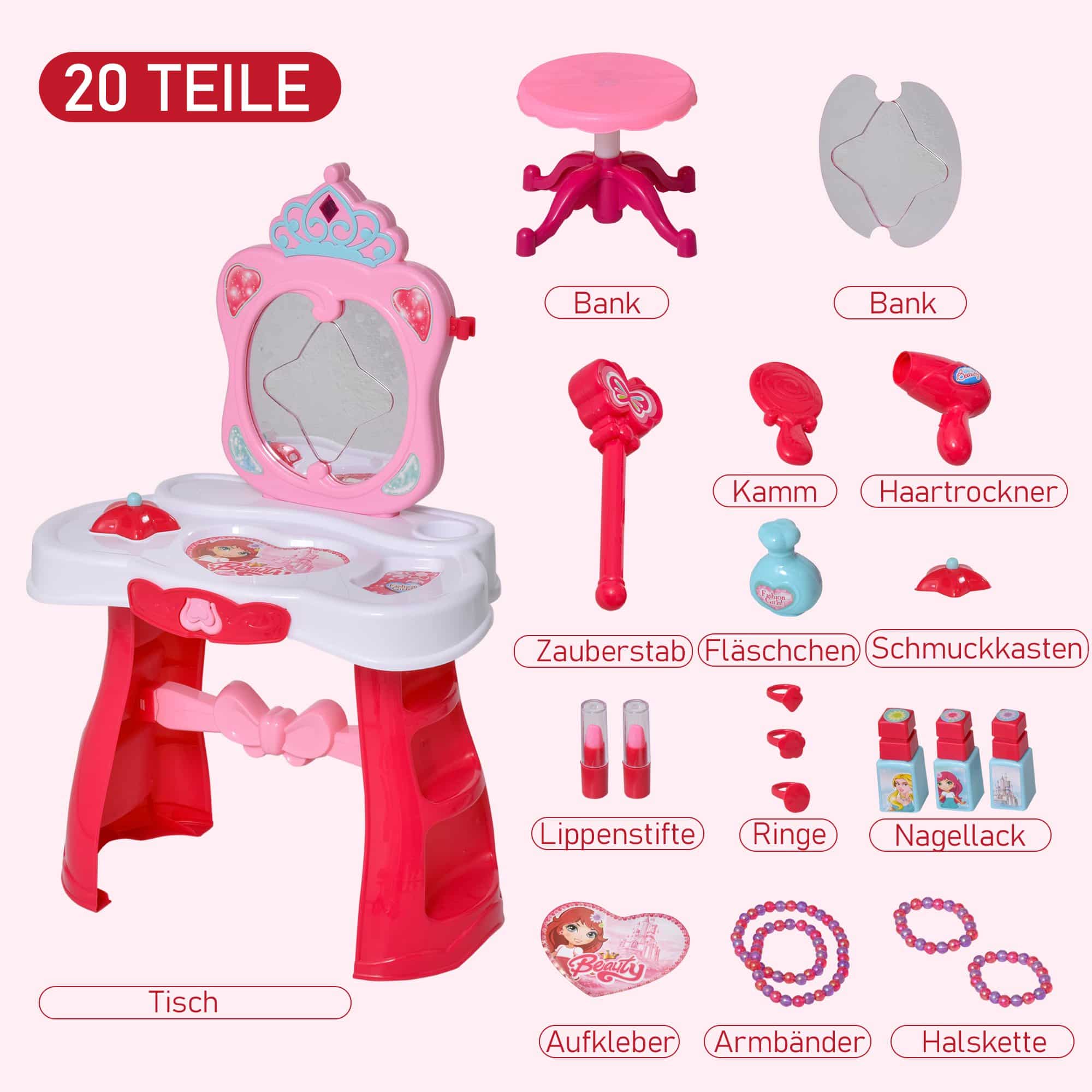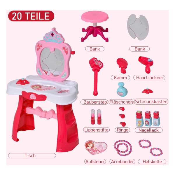 - Volledige set: Perfect voor kinderen tussen 3-6 jaar oud. Inclusief kaptafel, bank, spiegel, toverstaf, kam, föhn, make-updoos, fles, lippenstiften, ringen, nagellakken, sticker, armbanden en ketting.