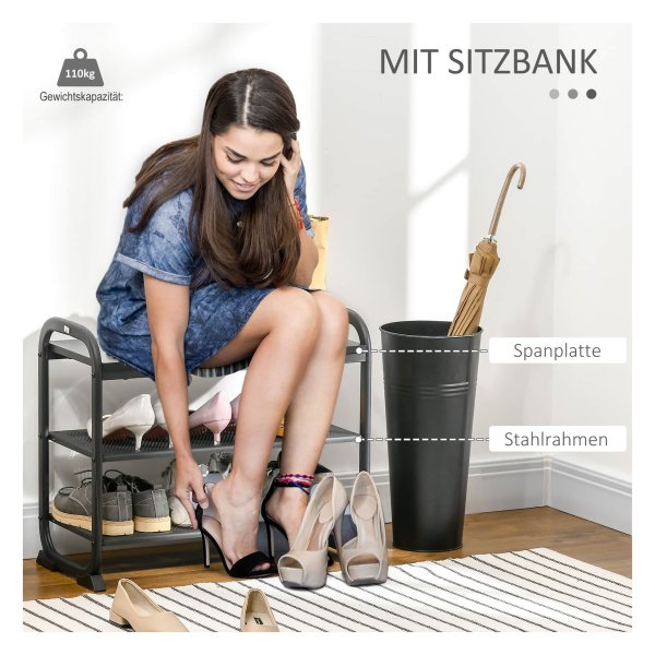 Met dit meubelstuk heb je niet alleen een handige plek om je schoenen netjes op te bergen, maar ook een comfortabele zitplaats dankzij de brede stoel bovenop. De twee schoenenplanken onder de stoel bieden ruimte voor wel 6 paar schoenen, waardoor je altijd een overzichtelijke opslag hebt voor al je favoriete schoenen.