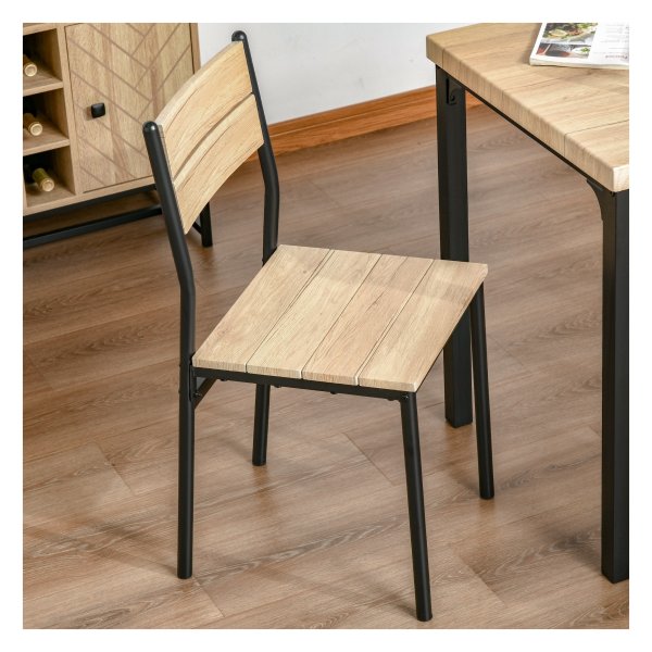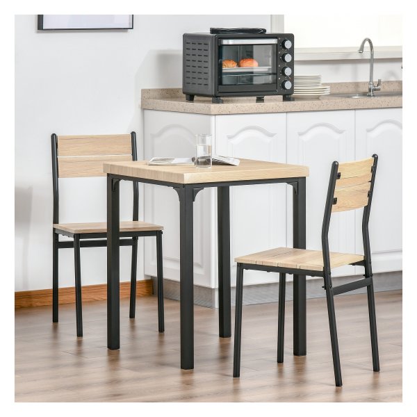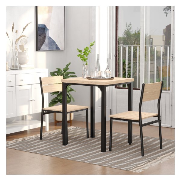 De set bestaat uit een houten tafel en twee bijpassende stoelen, gemaakt van hoogwaardig MDF en een stabiel stalen frame voor een lange levensduur. Dankzij het Care oppervlak zijn de meubelstukken eenvoudig schoon te maken, waardoor ze er altijd als nieuw uitzien. Bovendien is de eetkamerset gemakkelijk te monteren, zodat u snel kunt genieten van uw nieuwe aanwinst.