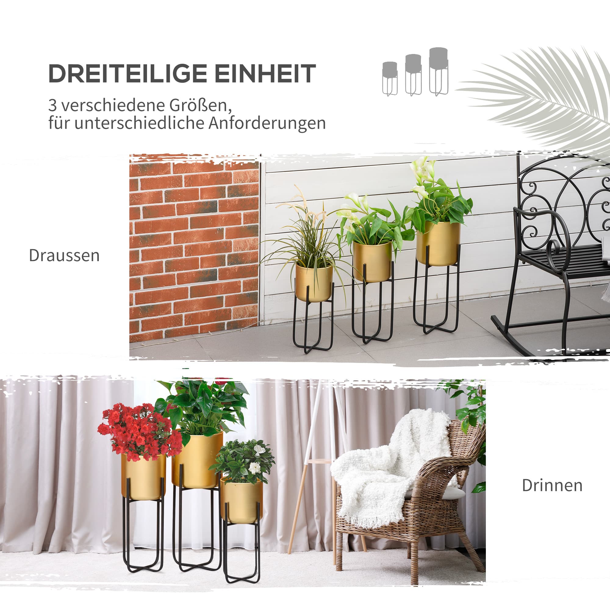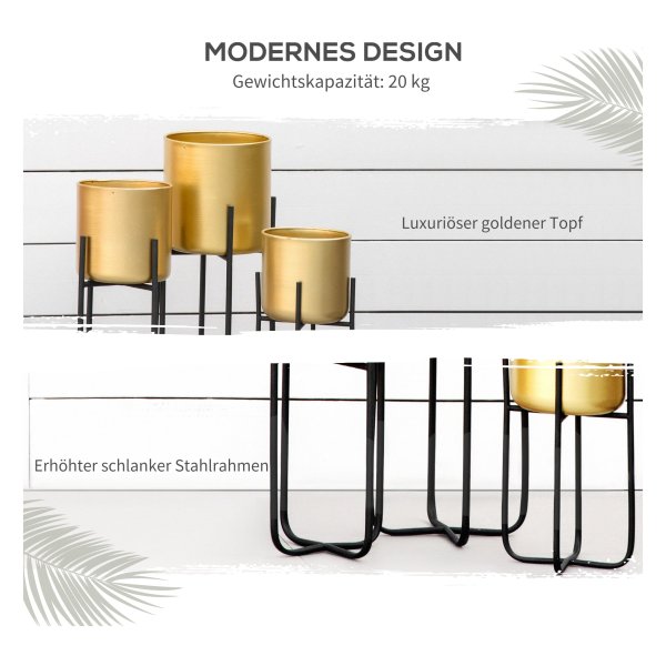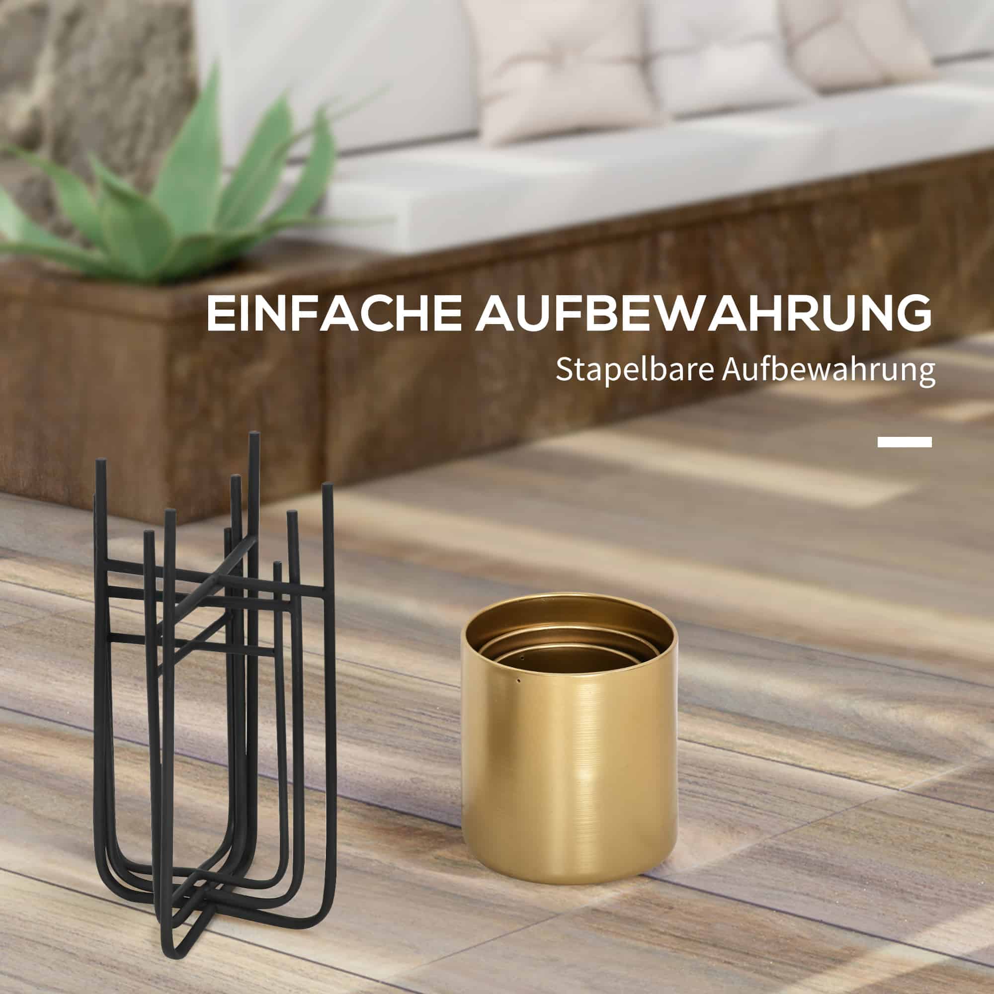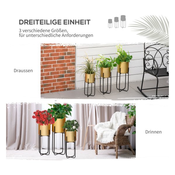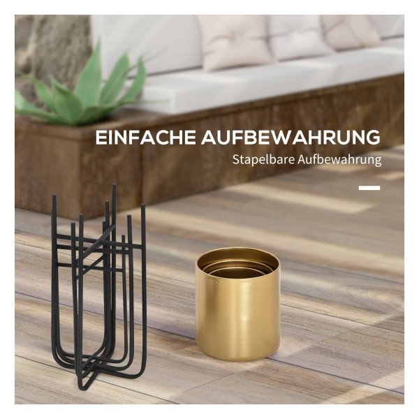 Deze bloemenstandaard voegt een decoratief accent toe aan je entree, woonkamer of tuin. De gouden kleur van het metaal brengt een vleugje luxe in elke ruimte, terwijl de stevige constructie zorgt voor stabiliteit en duurzaamheid. De potten zijn stapelbaar voor compacte opslag en hebben drainagegaten voor overtollig water, waardoor ze zowel binnen als buiten ideaal zijn.