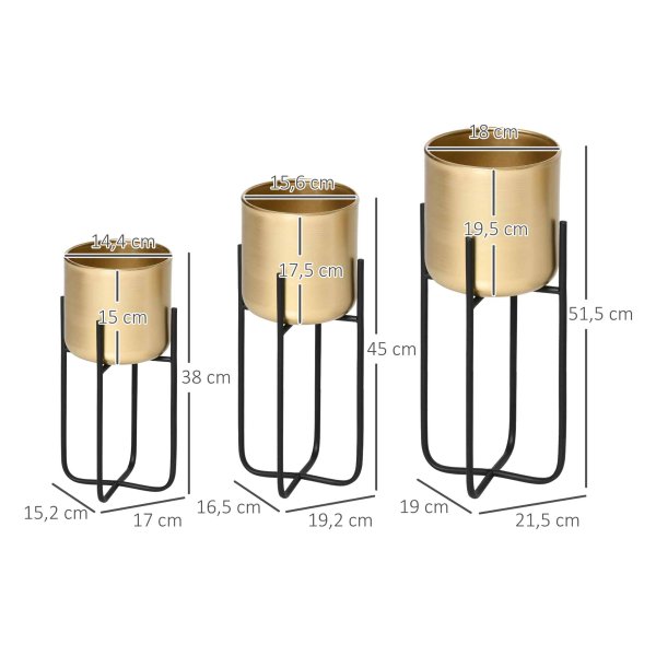 Deze prachtige bloemenstandaard is gemaakt van hoogwaardig metaal in een mooie gouden kleur. De afmetingen zijn 21,5 cm lang x 19 cm breed x 51,5 cm hoog voor de grote pot, 19,2 cm lang x 16,5 cm breed x 45 cm hoog voor de middelgrote pot, en 17 cm lang x 15,2 cm breed x 38 cm hoog voor de kleine pot. De potten kunnen elk tot 20 kg dragen en zijn geschikt voor verschillende planten en bloemen.