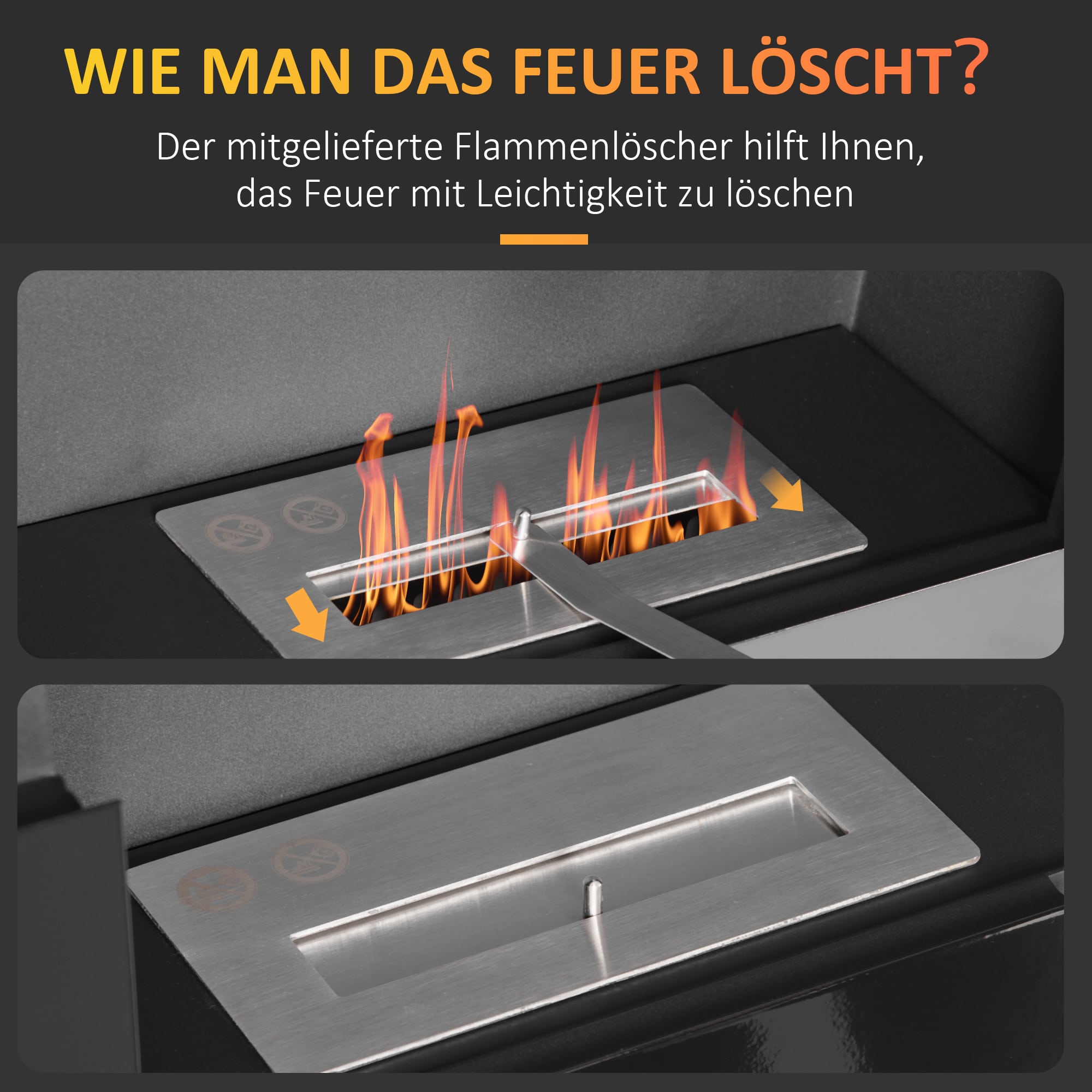 De wordt geleverd met een ethanol open haard, een roestvrijstalen blusdeksel en duidelijke instructies voor montage en gebruik. Let op: gebruik alleen de voorgeschreven brandstoffen zoals vermeld in de handleiding om de veiligheid te waarborgen.