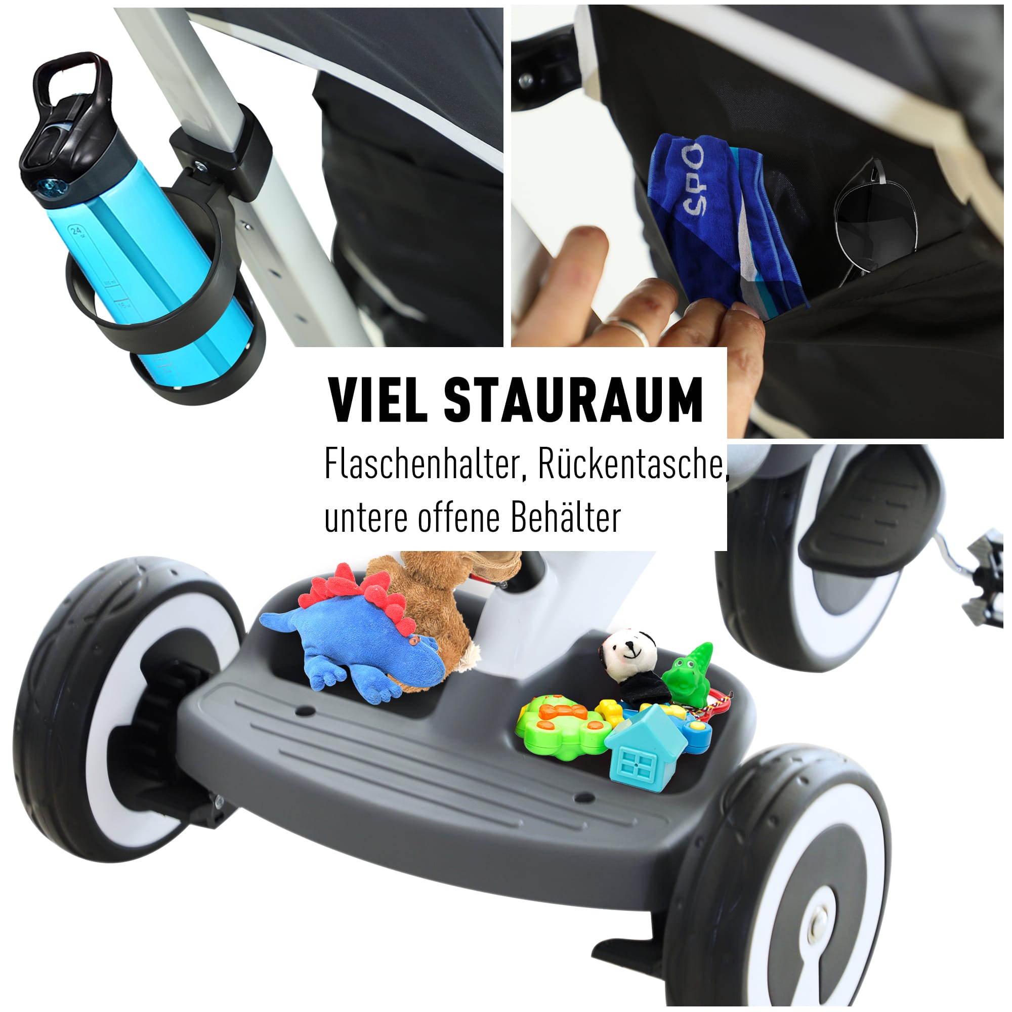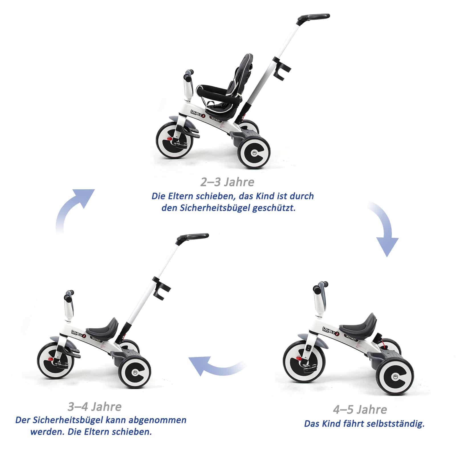 Met het 4-in-1 design van deze kinderdriewieler is hij uiterst flexibel in gebruik. Dankzij de eenvoudige montage en demontage van de onderdelen kan deze driewieler worden gebruikt als kinderwagen, loopstoeltje en driewieler met of zonder duwer. Op deze manier kunnen kinderen vanaf 18 maanden oud al gebruik maken van deze driewieler en zich voorbereiden op het echte fietsen.
