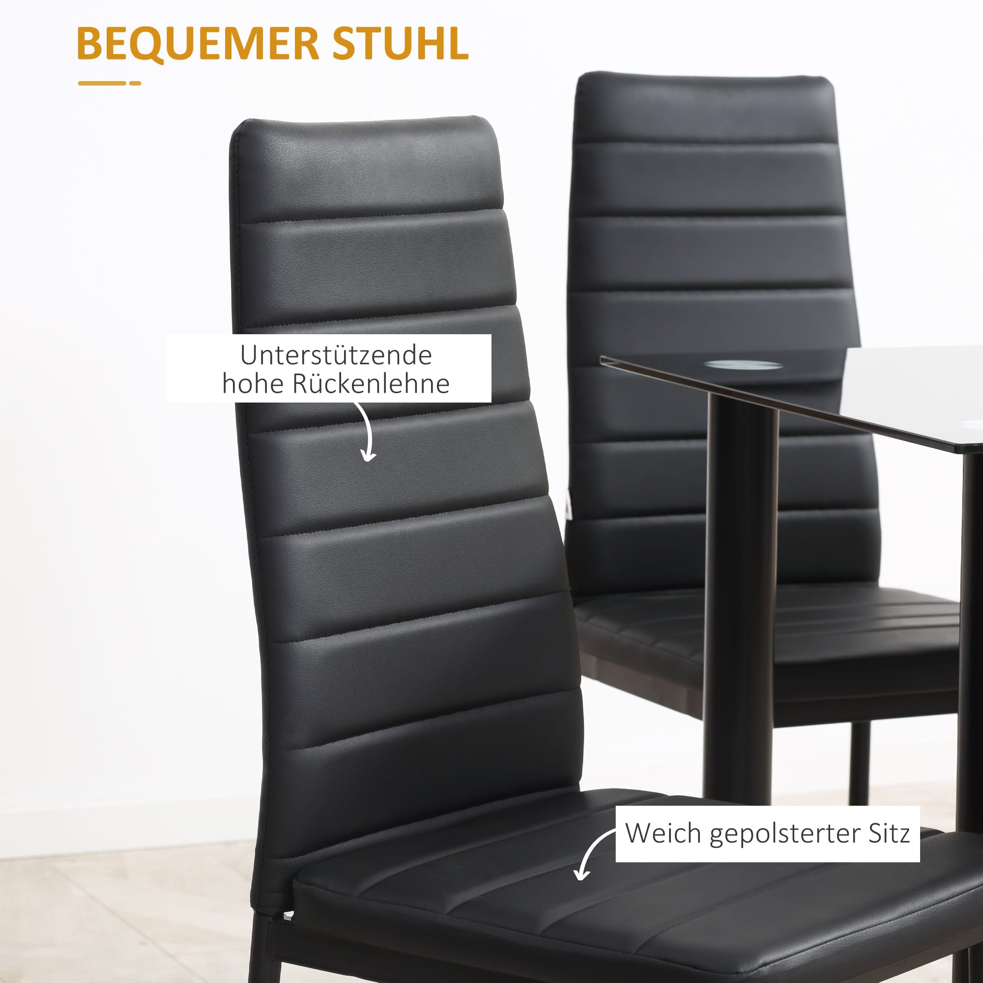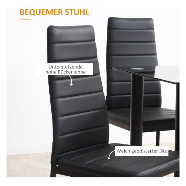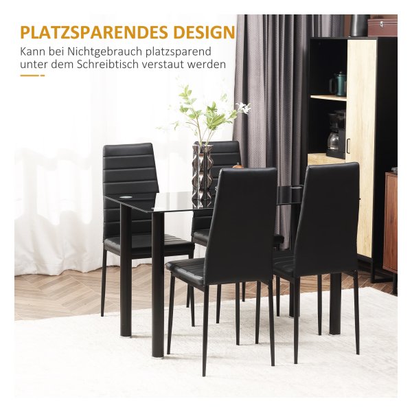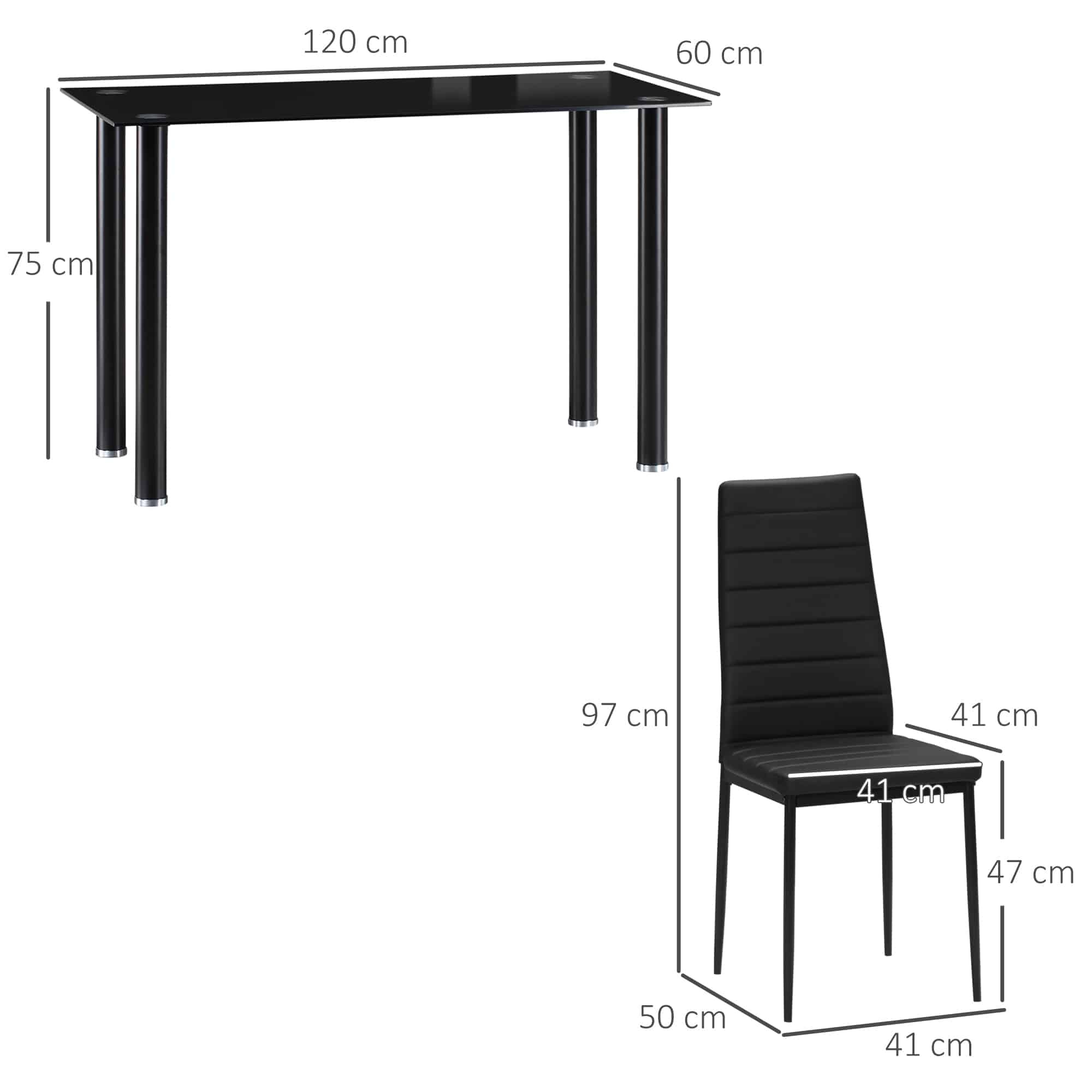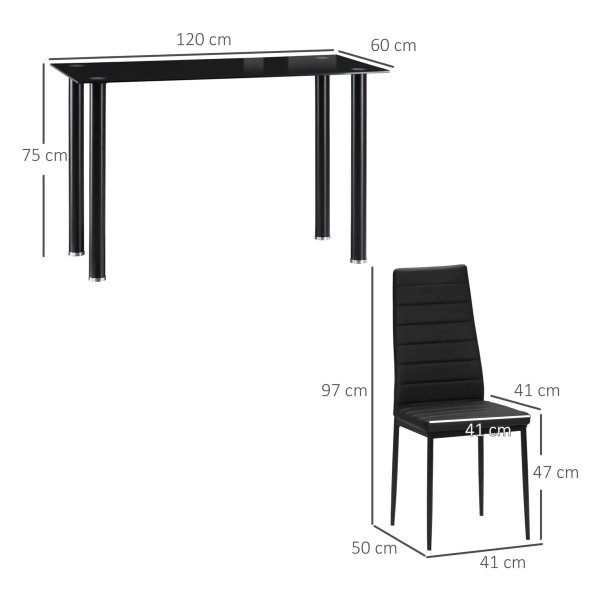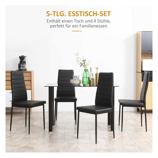De eetkamerset wordt geleverd in de kleur zwart en is gemaakt van hoogwaardige materialen zoals hard glas, staal, plastic en schuim. De tafel en stoelen hebben een draagvermogen van respectievelijk 30 kg en 120 kg. Voor de montage is een handleiding bijgevoegd, zodat je de set eenvoudig in elkaar kunt zetten.