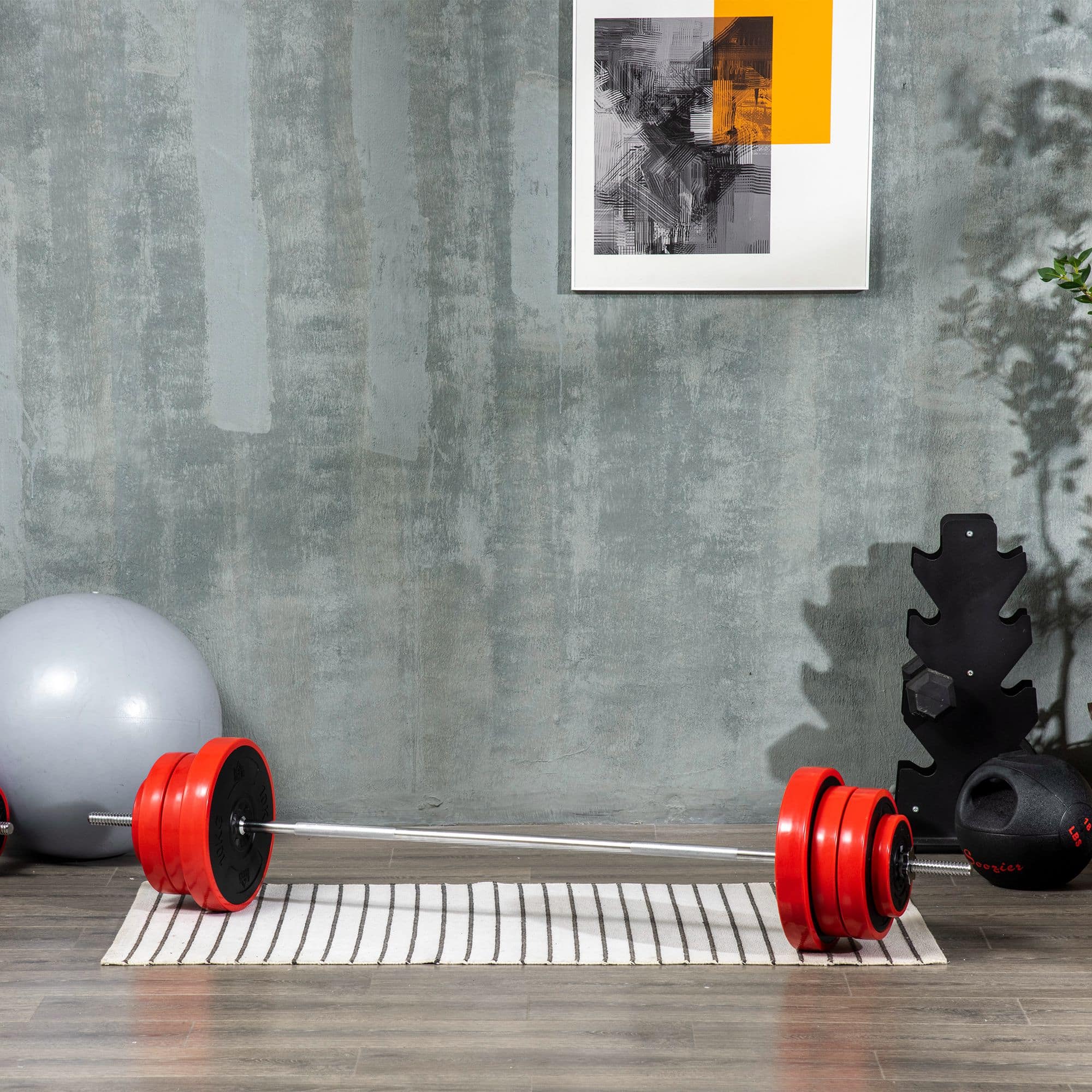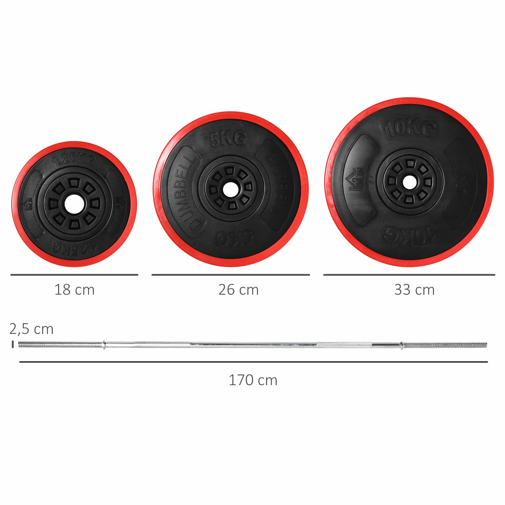 Deze halterset is uitgevoerd in een opvallende rode kleur, gemaakt van hoogwaardig ijzer en rubber voor een lange levensduur. De set bestaat uit:
