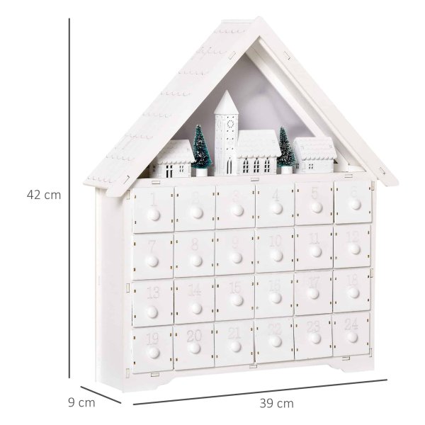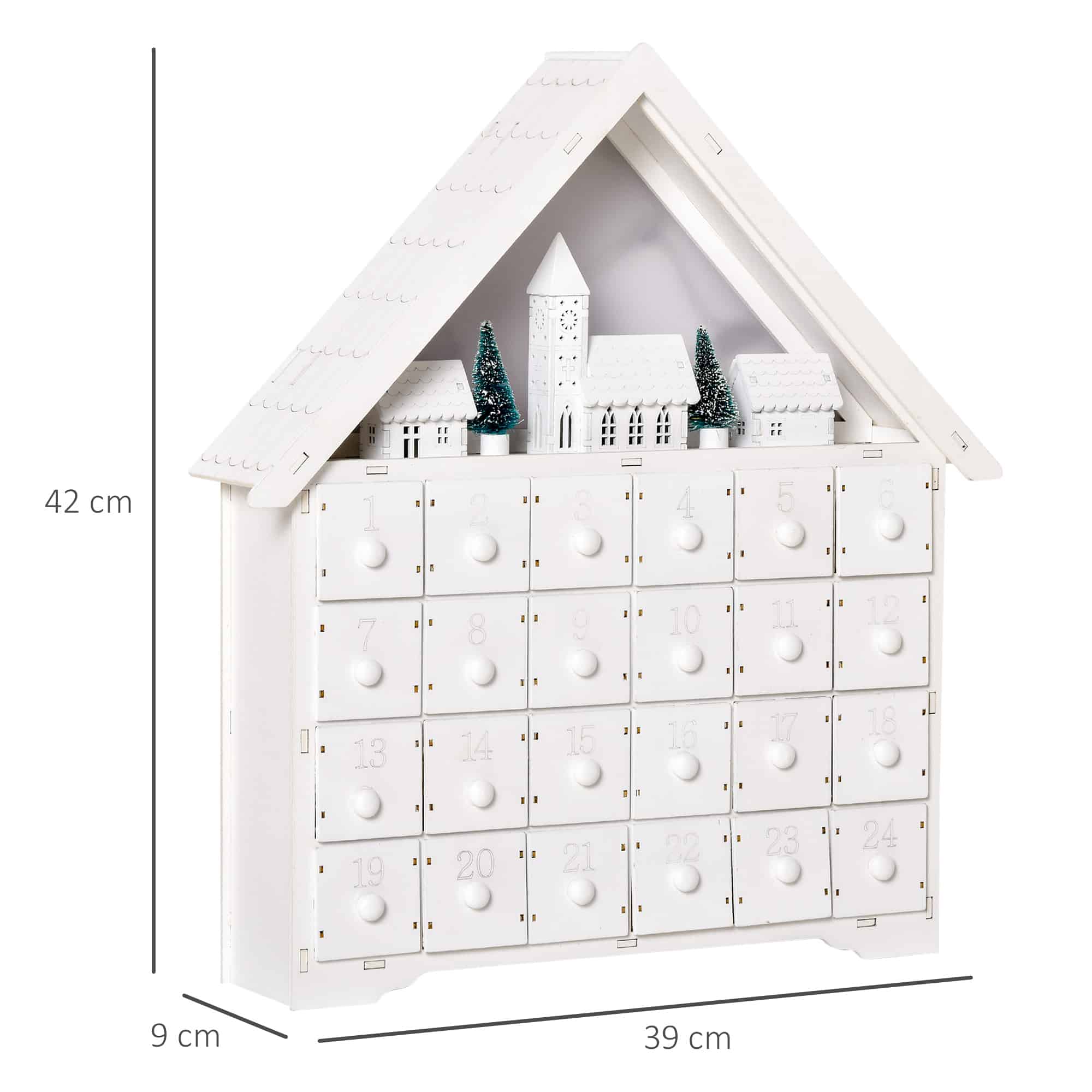 De adventskalender heeft een witte kleur en heeft de volgende afmetingen: 39 cm breed, 9 cm diep en 42 cm hoog. De lades variƫren in grootte, met een lade afmeting van 4.5 cm breed, 4.7 cm diep en 4.5 cm hoog voor het merendeel van de lades. Er zijn ook grotere lades met afmetingen van 4.5 cm breed, 5.8 cm diep en 4.5 cm hoog.