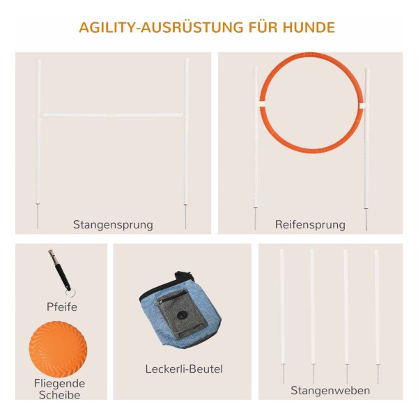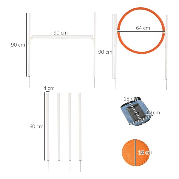 - De 5-delige set bevat een springhindernis, een springring, slalomstangen, een frisbee en een voederzak.