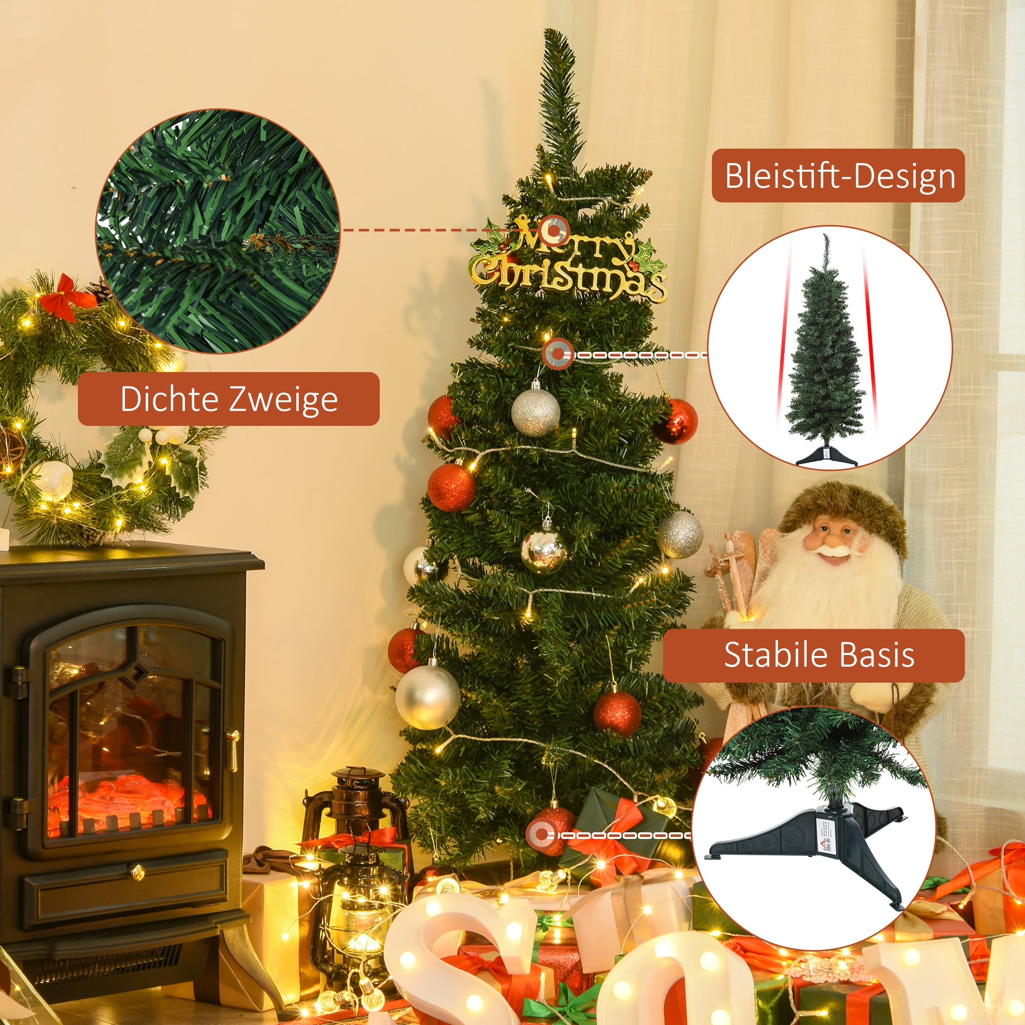Met een hoogte van 1,2 meter en een potloodvormige structuur past deze kerstboom perfect in hoeken, kleine kamers en andere ruimtes met beperkte vloeroppervlakte. De boom biedt voldoende ruimte voor decoratieve ornamenten en gadgets, waardoor je creatief kunt zijn en de boom kunt personaliseren op jouw eigen manier.