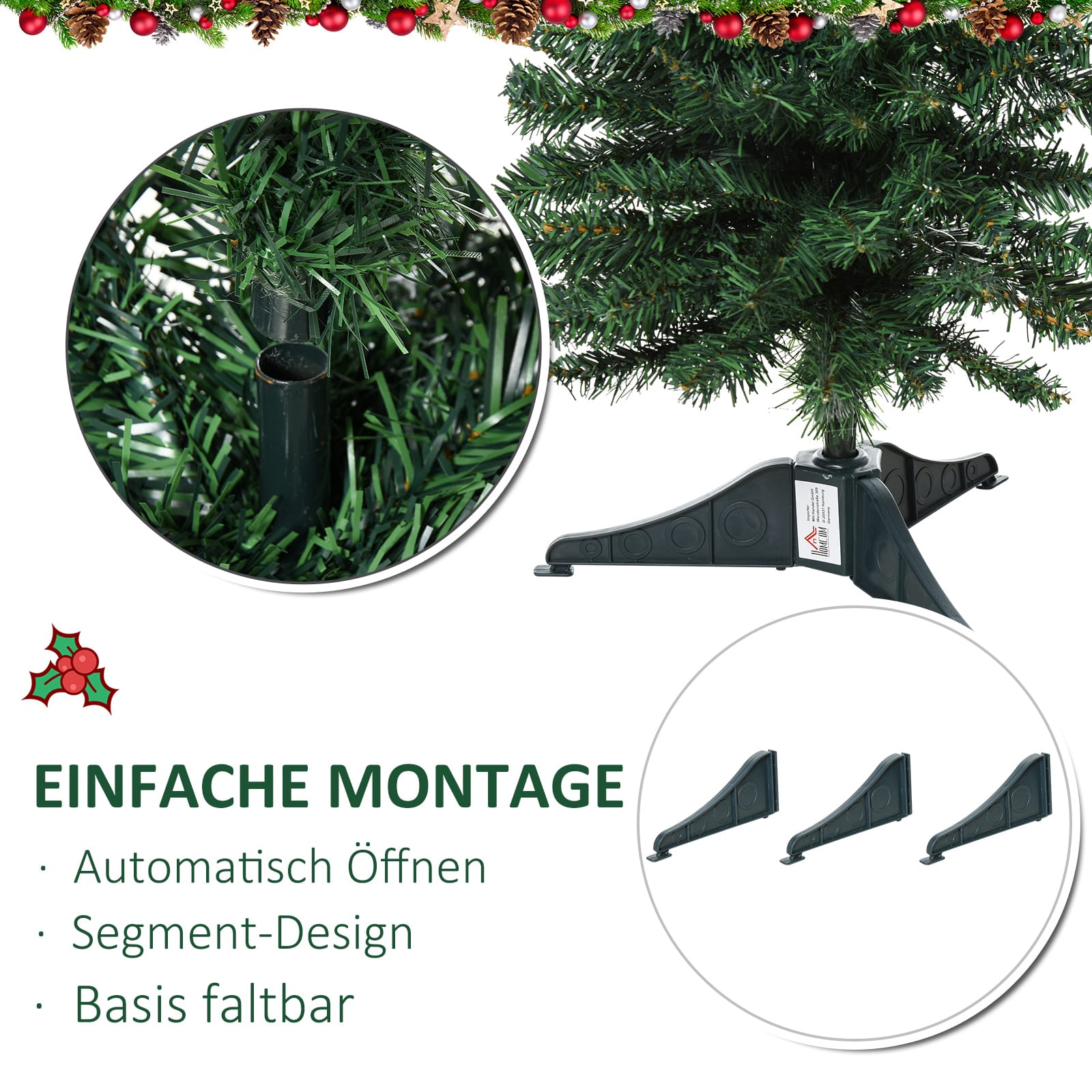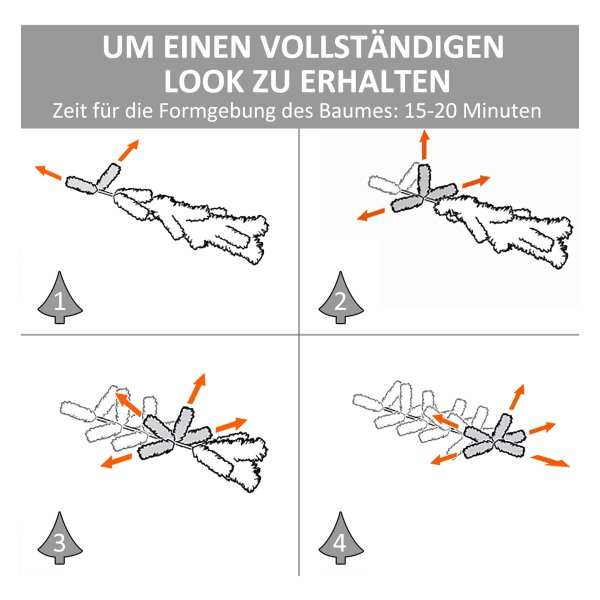 De opvouwbare takken van de boom zorgen voor een snelle en eenvoudige montage, evenals demontage voor opslag na de feestdagen. De plastic basis is ook demontabel en opvouwbaar, waardoor het opbergen van de boom een fluitje van een cent is.