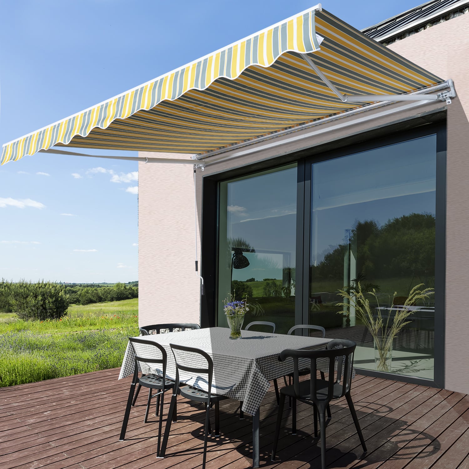 - De luifel is eenvoudig te bedienen met behulp van de handkast, waardoor je de hellingshoek gemakkelijk kunt aanpassen.