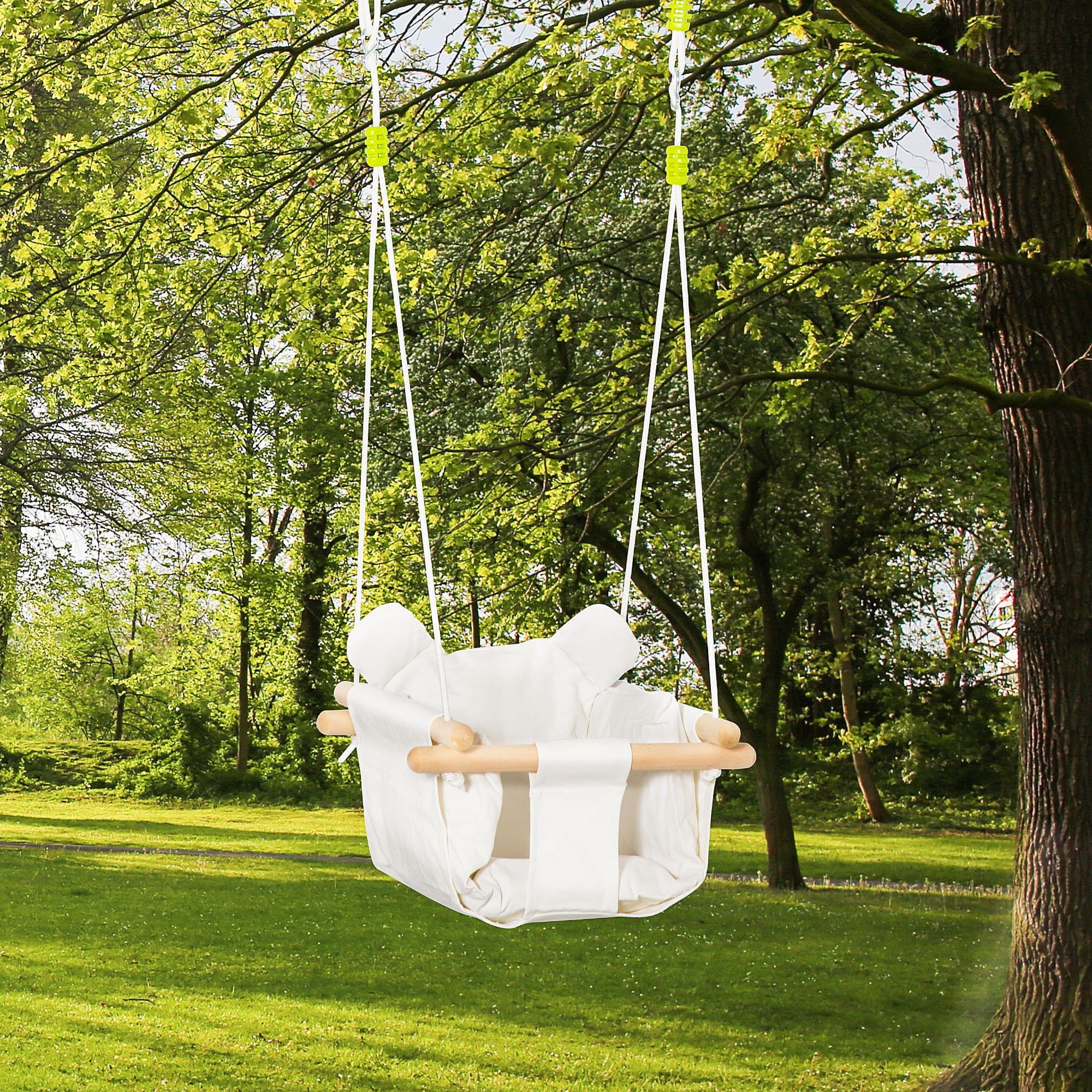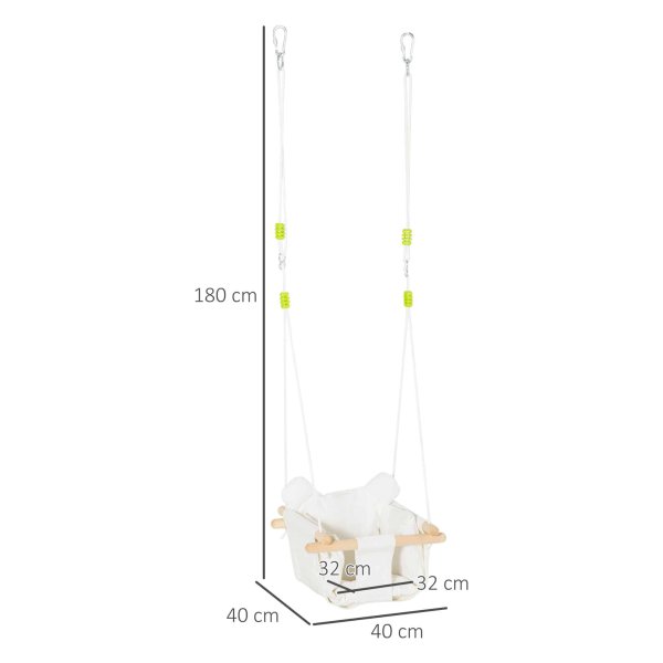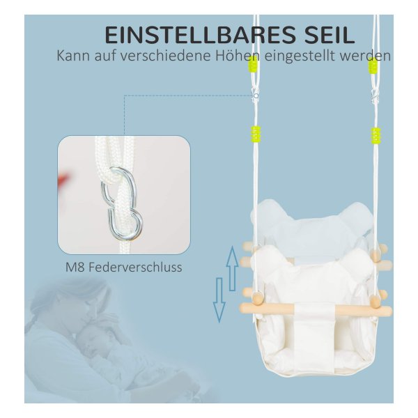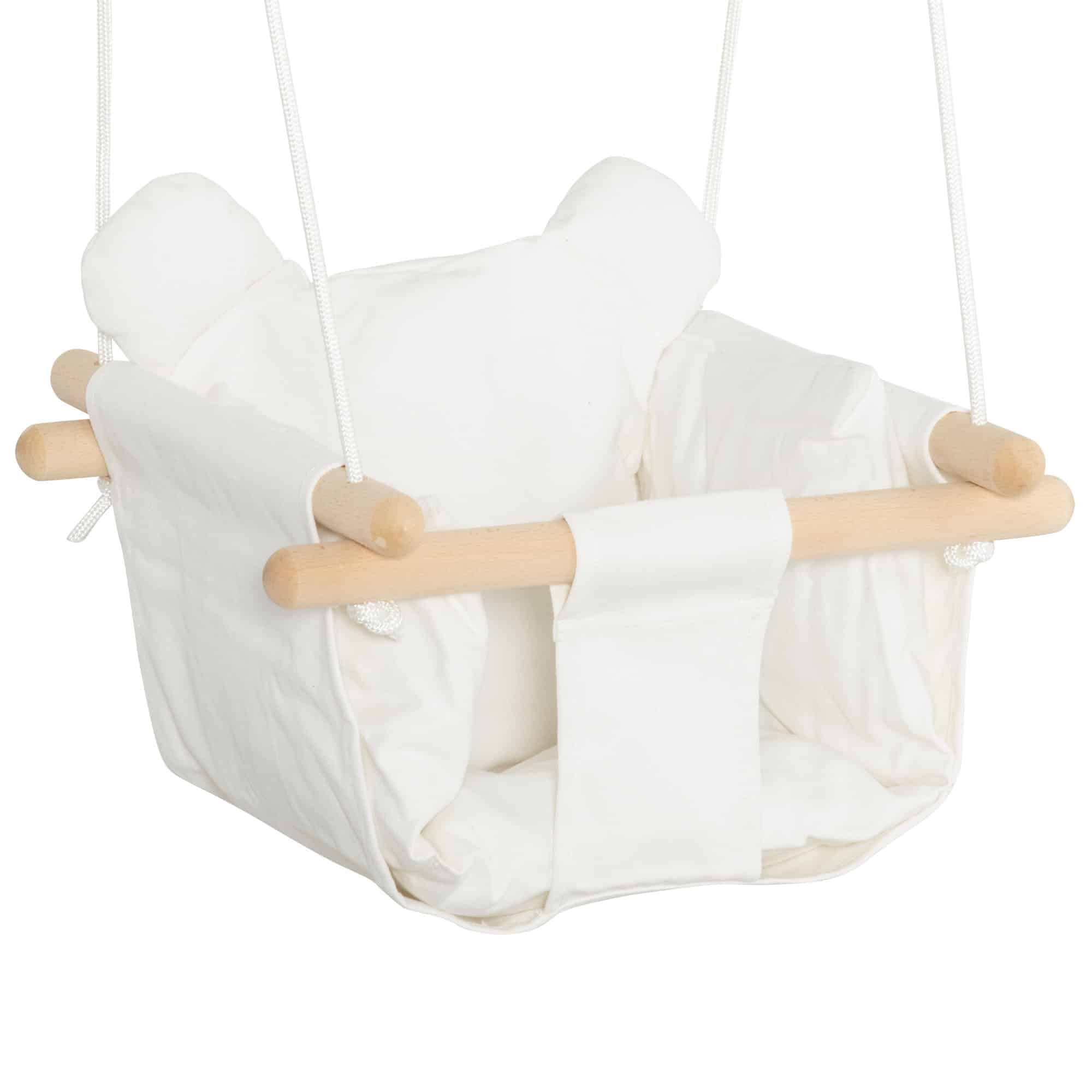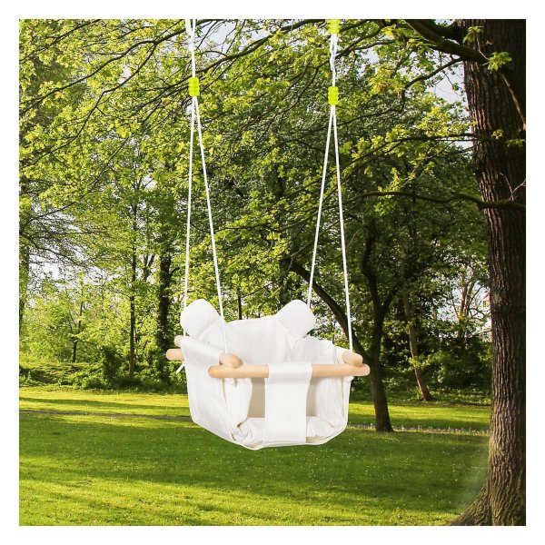 Het babyzitje van de babyschommel is gemaakt van 100% katoenen canvas, dat zacht en veilig is voor de gevoelige huid van je kind. Dankzij het comfortabele kussen op de zitting en de rugleuning kan je kind veilig en vrolijk schommelen, terwijl de veiligheidsgordel ervoor zorgt dat ze altijd goed vastzitten. Met deze babyschommel hoeft niemand zich zorgen te maken over valpartijen.