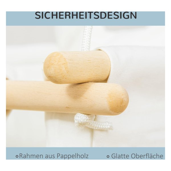 De babyschommel is gemaakt van hoogwaardige materialen, inclusief een stevig houten frame en een robuust touw. Het houten frame kan moeiteloos een gewicht tot 80 kg dragen, waardoor het geschikt is voor kinderen van 6 maanden tot 3 jaar oud. Bovendien is de lengte van het touw eenvoudig aan te passen, zodat je de schommelhoogte snel en gemakkelijk kunt wijzigen voor optimaal speelplezier.