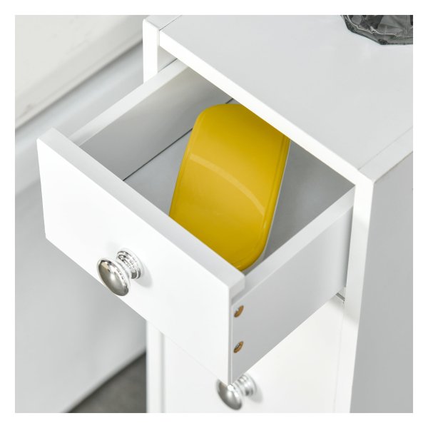 Met twee laden met verschillende indelingen en een geheim vak bovenop, biedt deze badkamerkast voldoende ruimte voor al uw badkamerspullen. De zilveren chroom-geplateerde handgrepen maken het gemakkelijk om de laden te openen en sluiten, terwijl het moderne en compacte ontwerp perfect past in elke badkamer.