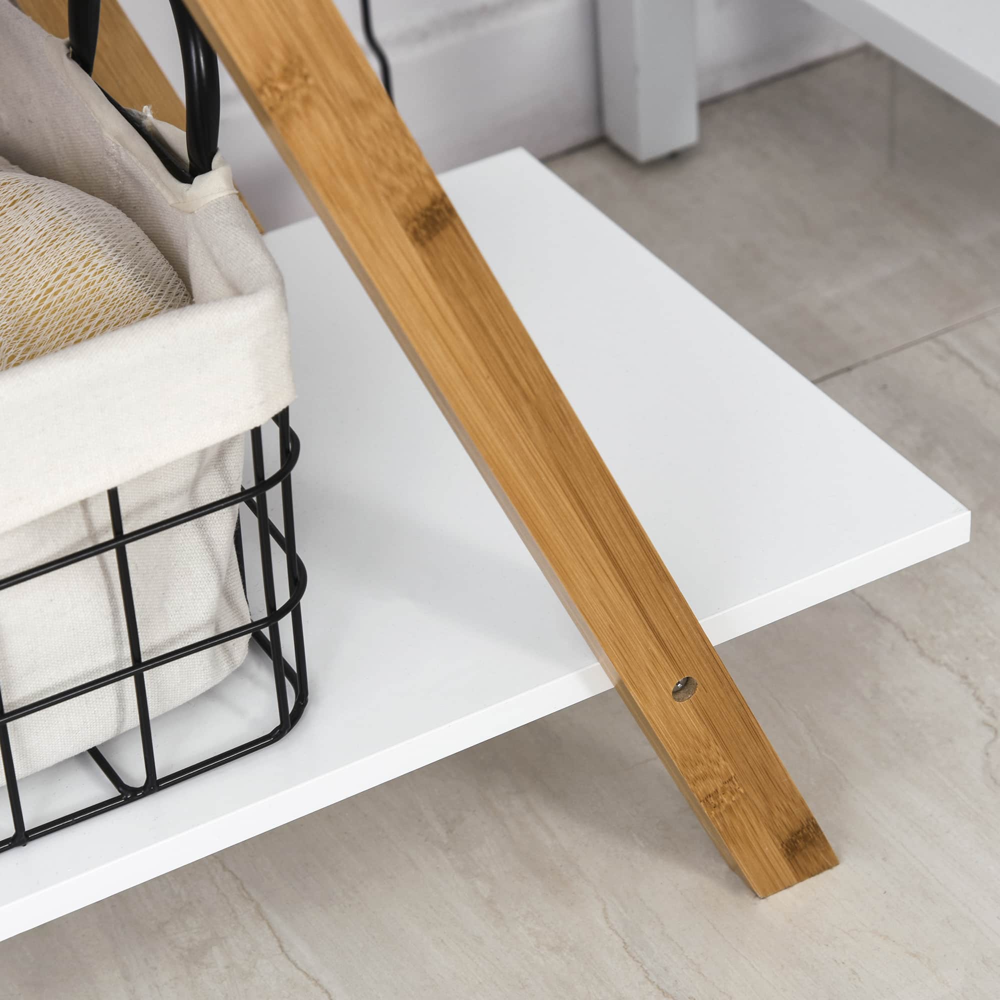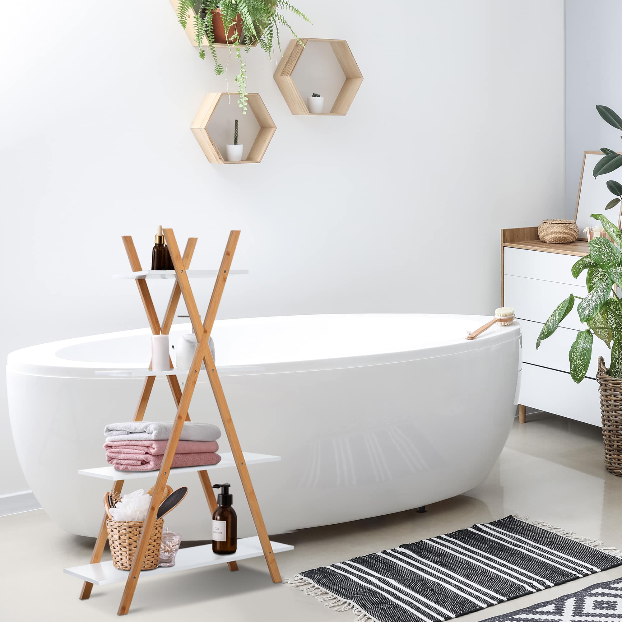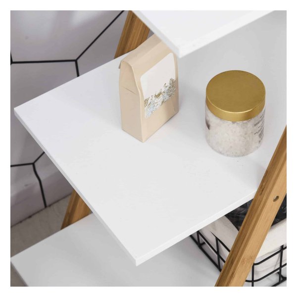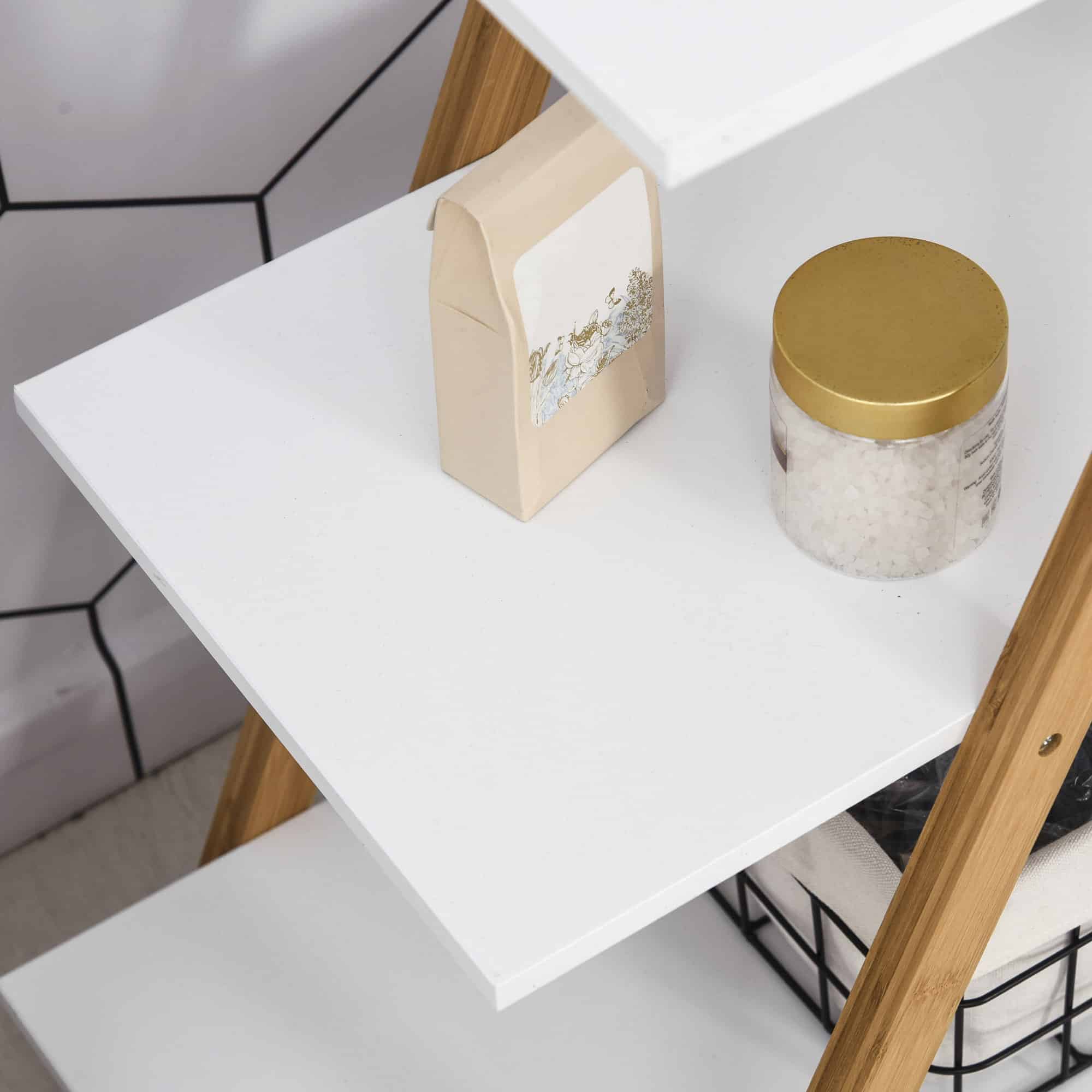 Deze badkamerplank is niet alleen functioneel, maar ook esthetisch aantrekkelijk. De combinatie van natuurlijk bamboe en witte planken geeft een frisse en moderne uitstraling aan elke badkamer, terwijl de 4 niveaus voldoende ruimte bieden voor al uw opbergbehoeften.