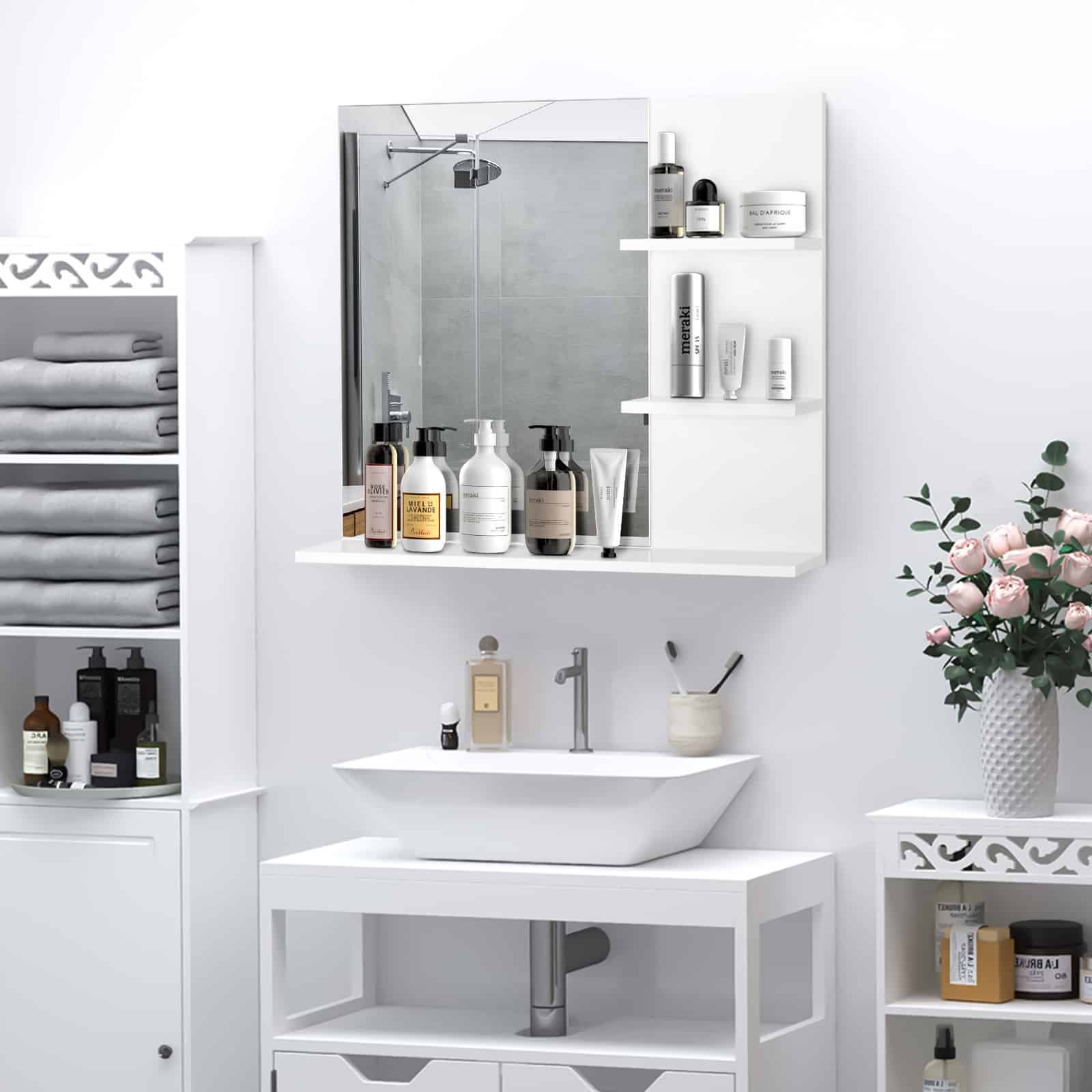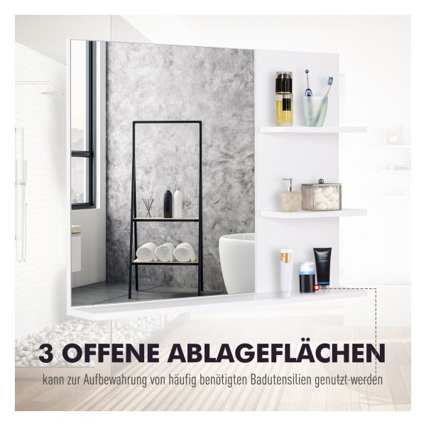 Het badkamerspiegelschap beschikt over drie open planken gemaakt van hoogwaardig MDF, waardoor u voldoende ruimte heeft voor het opbergen van al uw badkamergerei. Of het nu gaat om handdoeken, cosmetica of andere benodigdheden, dit schap biedt voldoende opslagruimte voor al uw spullen. Dit zorgt ervoor dat uw badkamer opgeruimd en georganiseerd blijft.