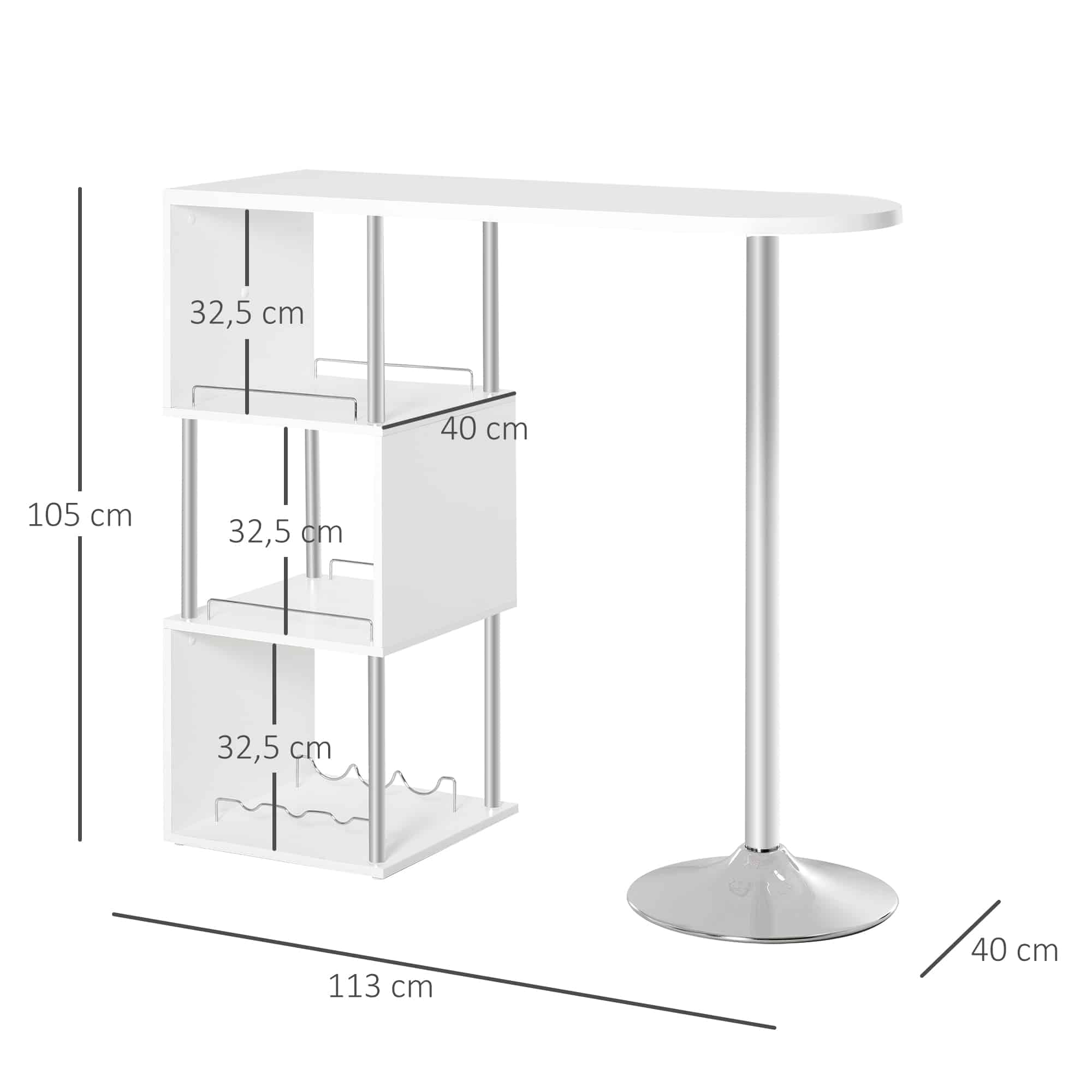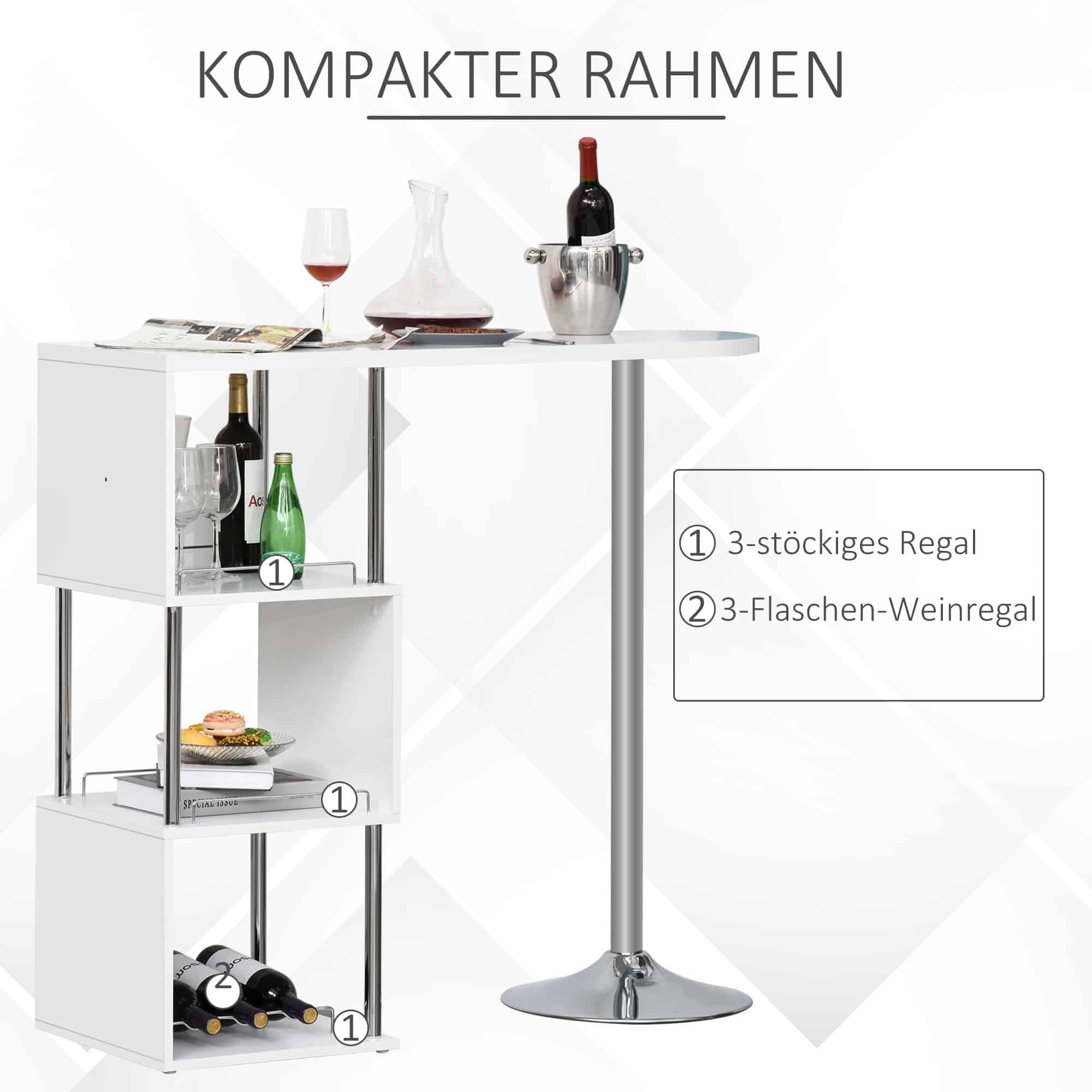 De bartafel heeft een 3-verdiepingen plank met opberglades en een wijnplank voor 3 flessen, waardoor u verschillende opslagmogelijkheden heeft. Het moderne ontwerp zorgt ervoor dat deze bartafel past in zowel moderne als traditionele omgevingen.