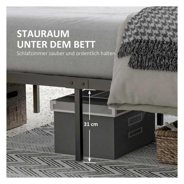 Dit bedframe biedt niet alleen een comfortabele slaapomgeving, maar ook voldoende ruimte voor het opbergen van verschillende objecten onder het bed. Kleding, beddengoed en andere spullen kunnen makkelijk worden opgeborgen, waardoor jouw slaapkamer altijd netjes en opgeruimd blijft.