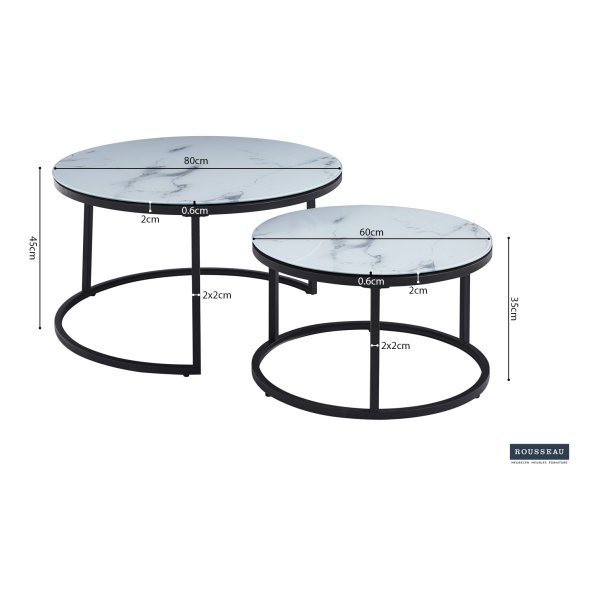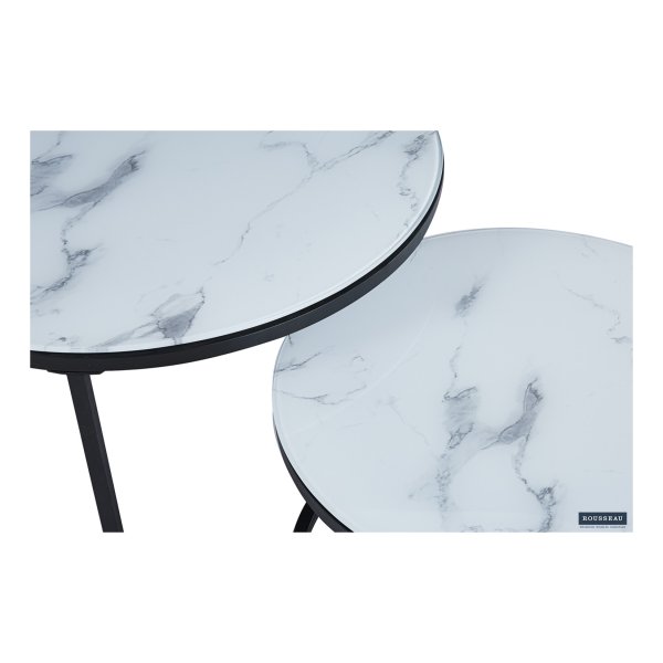 Frame in metaal, gepoedercoat met zwarte structuurlak voor een mat en slijtvast oppervlak. Het tafelblad bestaat uit veiligheidsglas. Onder het glas is een papieren decorlaag verlijmd, waardoor het oppervlak de uitstraling krijgt van een marmeren structuur, terwijl de glasplaat zorgt voor bescherming en duurzaamheid. Wanneer het glas toch breekt, valt het uiteen in kleine, onscherpe stukjes.