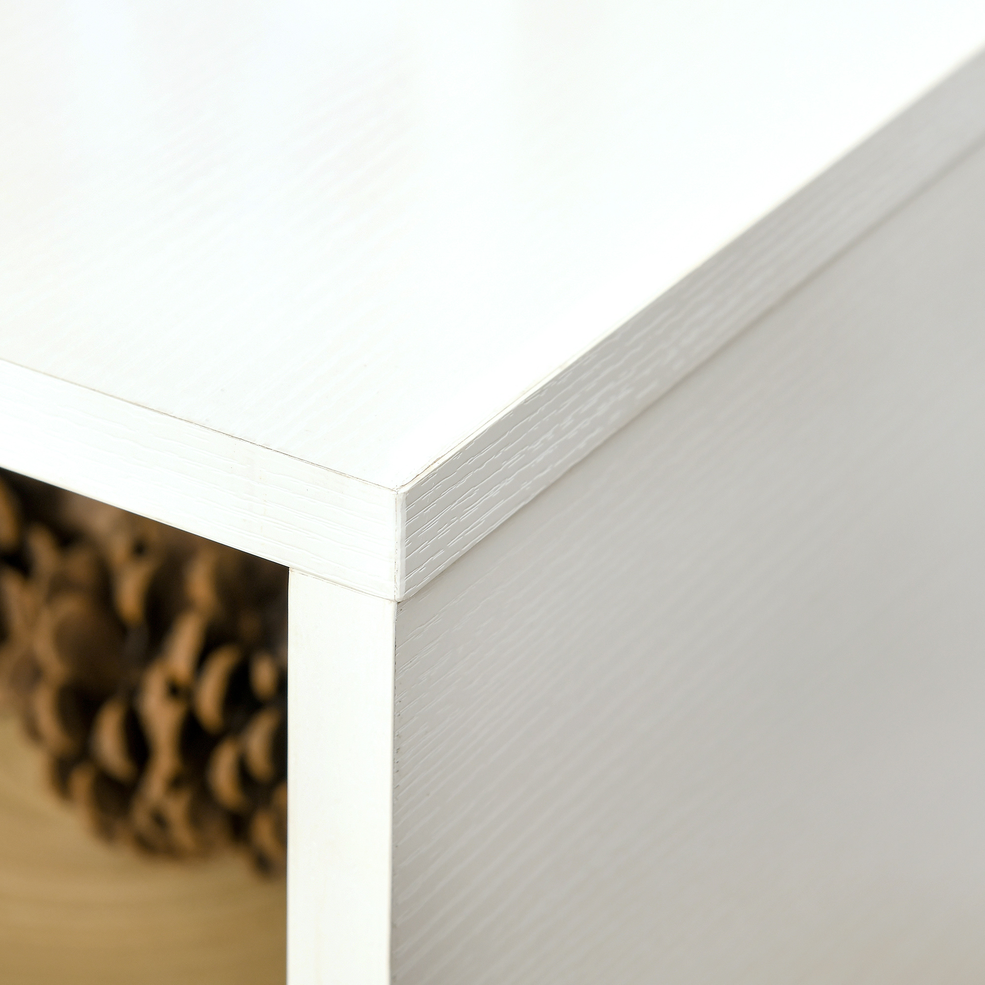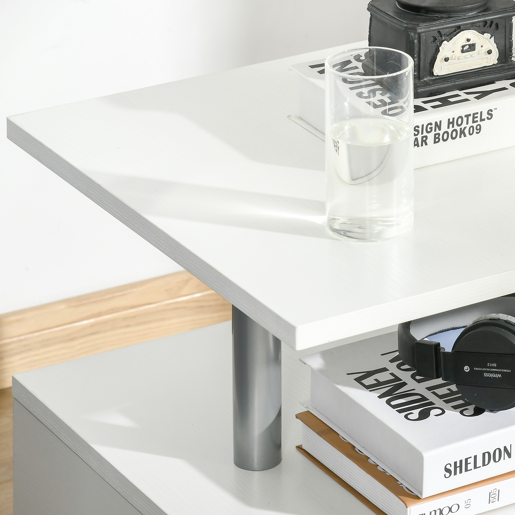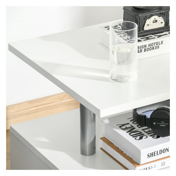 Deze bijzettafel is gemaakt van high-quality spaanplaat en wit staal, waardoor hij niet alleen stevig en duurzaam is, maar ook milieuvriendelijk. De open structuur van de tafel zorgt voor veel opslagopties, waardoor je al je spullen netjes georganiseerd kunt houden.