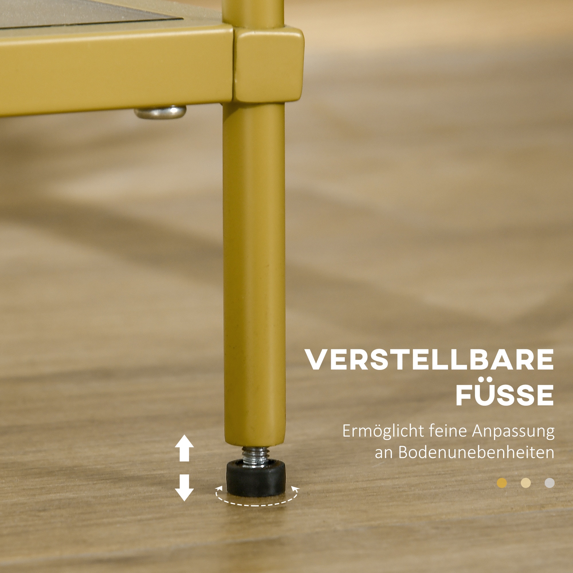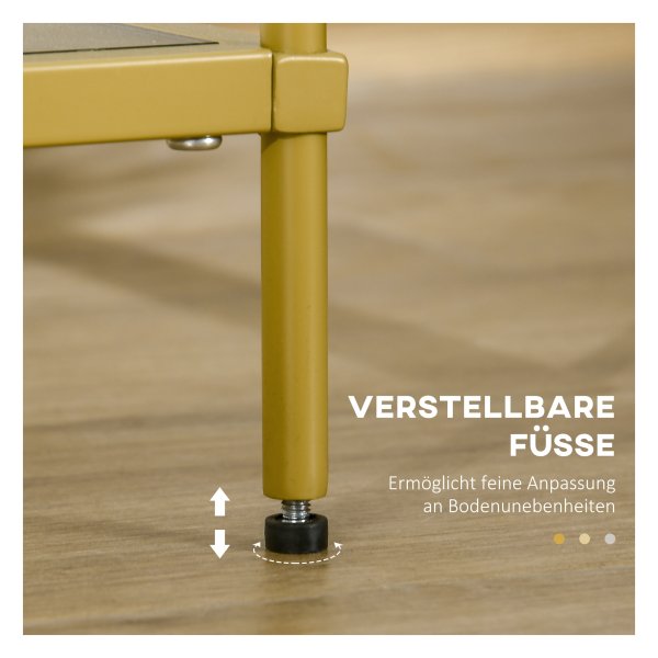 Het stalen frame en geharde glasplanken zorgen voor een duurzame constructie die jarenlang meegaat. De verstelbare plastic voeten zorgen voor een stabiele stand op elke ondergrond, zelfs op oneffen vloeren.