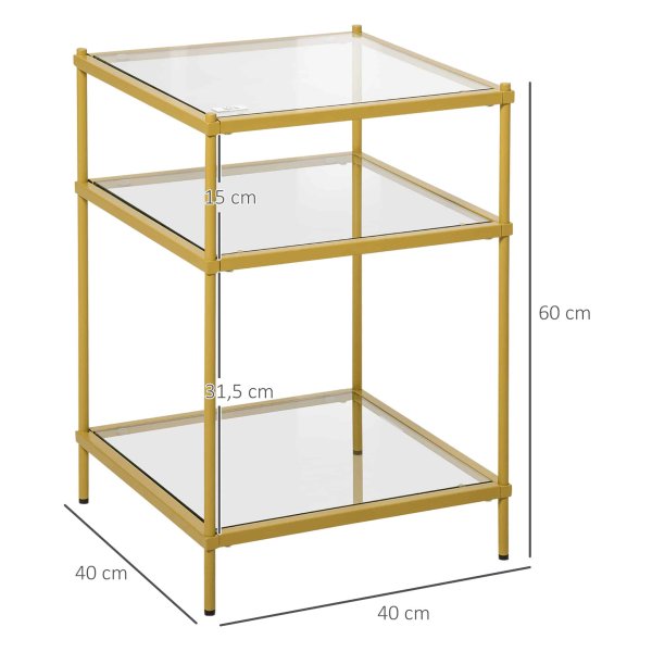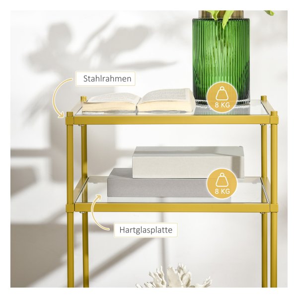 Met drie glazen planken biedt deze bijzettafel voldoende ruimte voor het organiseren van je favoriete boeken, planten of decoratieve items. De planken zijn stevig en kunnen elk tot 8 kg dragen, wat zorgt voor een praktische oplossing voor het opbergen van je persoonlijke spullen.