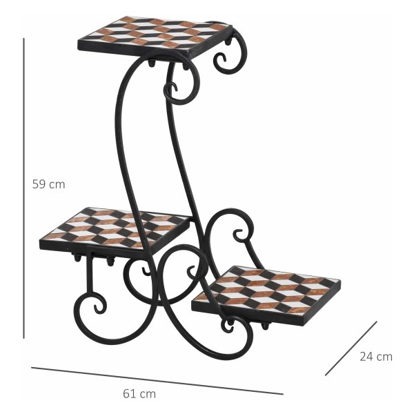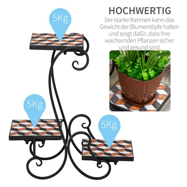 Met 3 vierkante houders is deze bloemenstandaard ideaal voor het tentoonstellen van potten en andere decoratieve objecten. Het klassieke mozaïekontwerp brengt een vleugje ouderwetse glamour naar uw buitenruimte en zorgt voor een unieke uitstraling. Of u het nu gebruikt als tentoonstellingsstandaard, decoratief element of opslagplank, deze bloemenstandaard is een veelzijdige en praktische toevoeging aan uw interieur of exterieur.