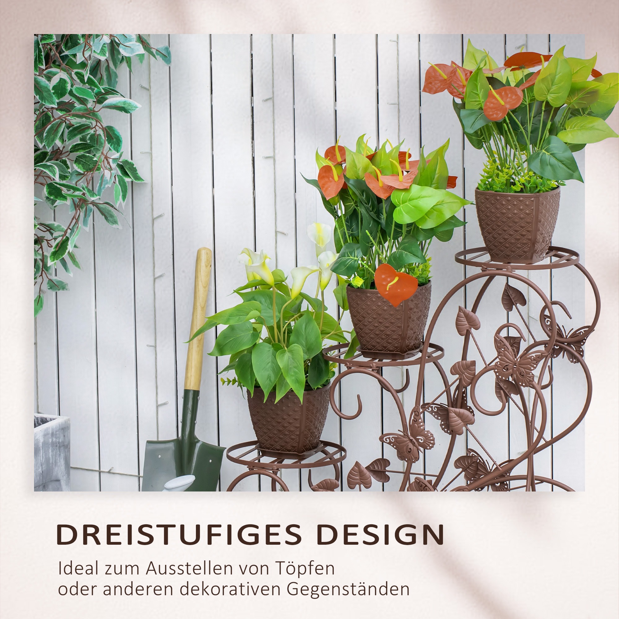 Met de open en verhoogde structuur is deze bloementrap ideaal voor eenvoudige drainage van overtollig water, waardoor je planten gezond en sterk blijven. Het leveringsbereik omvat een plantenplank en montage-instructies voor een vlotte installatie.