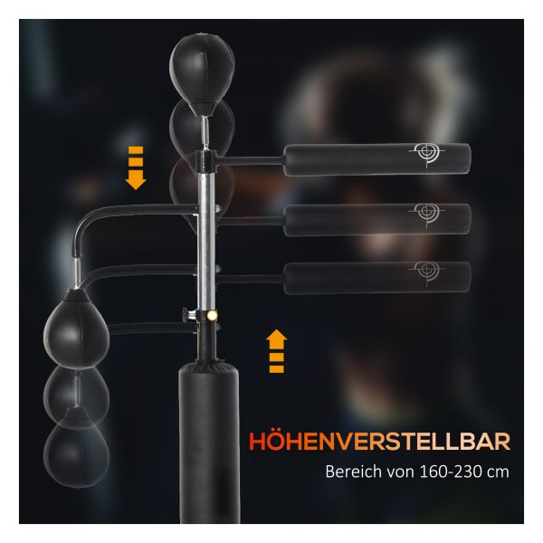 Deze bokszakstandaard biedt een 3-in-1-functie, waarbij je kunt genieten van de combinatie van ballen met twee snelheden, een reflexbar en een synthetisch lederen ponstas. Dit zorgt voor een gevarieerde en effectieve training. De hoogte van de standaard is volledig verstelbaar, variërend van 160 tot 230 cm, waardoor het geschikt is voor mensen van alle lengtes. Dit maakt het ideaal voor zowel volwassenen als kinderen.