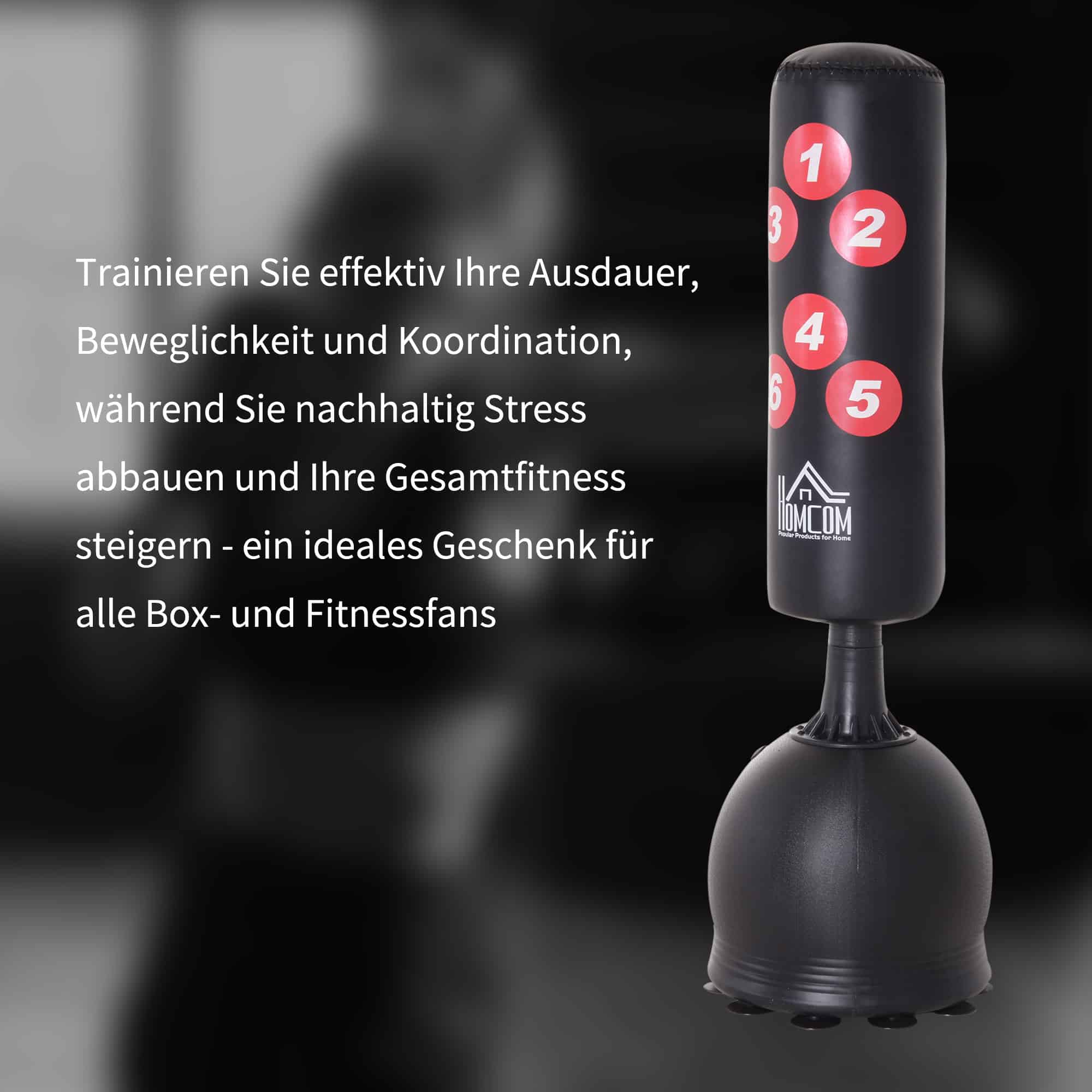 De bokszak heeft een stevige, vulbare stand die ervoor zorgt dat hij stabiel blijft staan. De zuignappen aan de onderkant zorgen voor extra houvast op schone en gladde oppervlakken, waardoor u veilig kunt trainen zonder dat de bokszak verschuift.