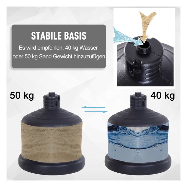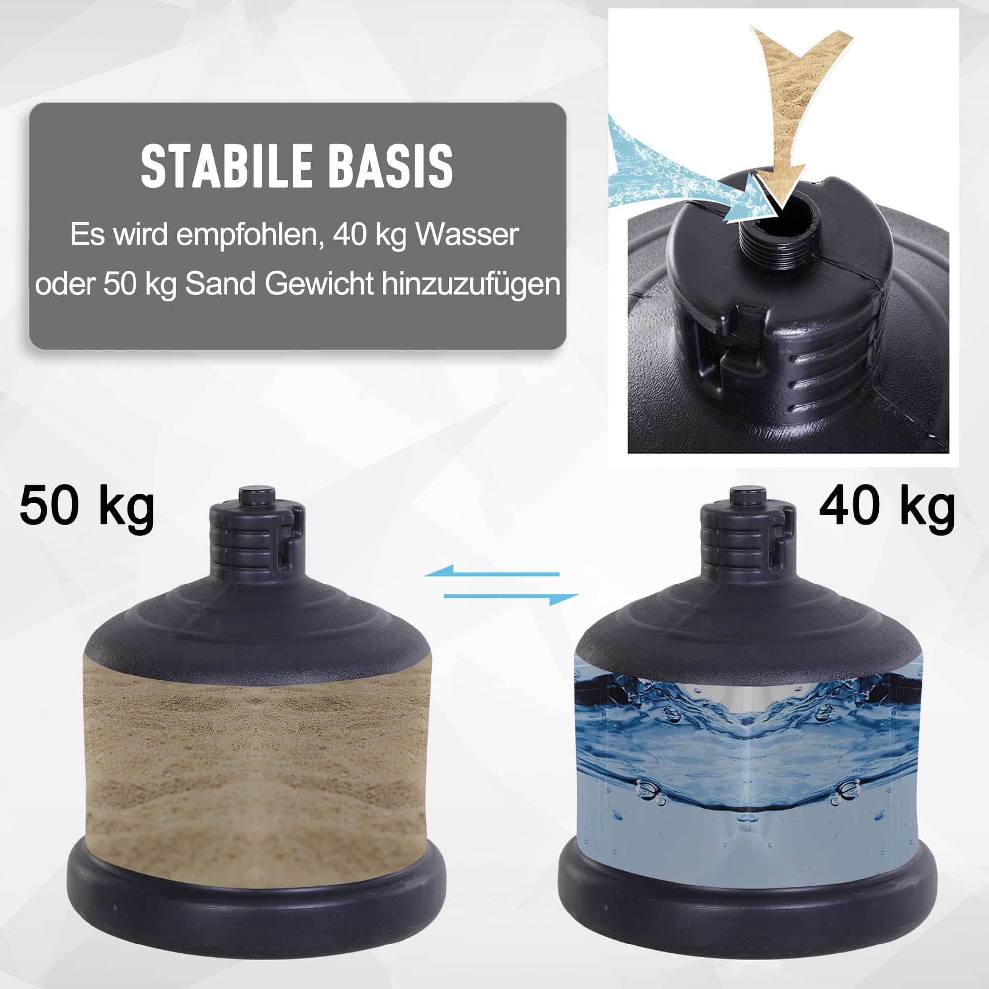 - Gewicht: 14,2 kg (netto), 40 kg (gevuld met water), 50 kg (gevuld met zand)